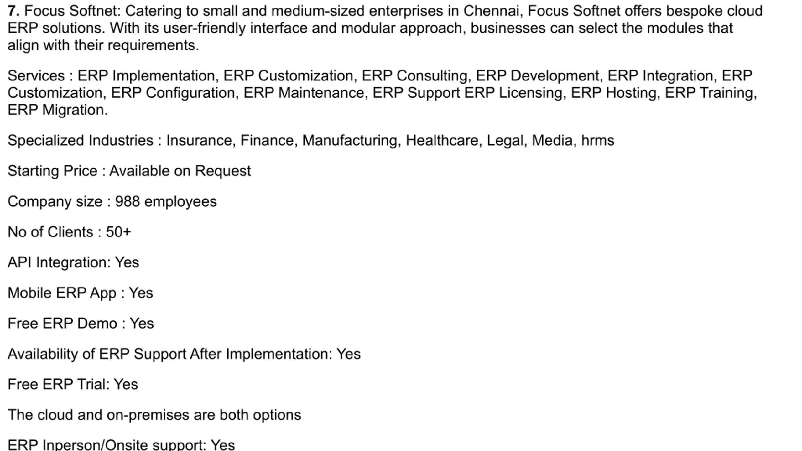 7. Focus Softnet: Catering to small and medium-sized enterprises in Chennai, Focus Softnet offers bespoke cloud ERP solutions. With its user-friendly interface and modular approach, businesses can select the modules that align with their requirements. Services : ERP Implementation, ERP Customization, ERP Consulting, ERP Development, ERP Integration, ERP Customization, ERP Configuration, ERP Maintenance, ERP Support ERP Licensing, ERP Hosting, ERP Training, ERP Migration. Specialized Industries : Insurance, Finance, Manufacturing, Healthcare, Legal, Media, hrms Starting Price : Available on Request Company size : 988 employees No of Clients : 50+ API Integration: Yes Mobile ERP App : Yes Free ERP Demo : Yes Availability of ERP Support After Implementation: Yes Free ERP Trial: Yes The cloud and on-premises are both options ERP Inperson/Onsite support: Yes Locations: Chennai, Hyderabad
