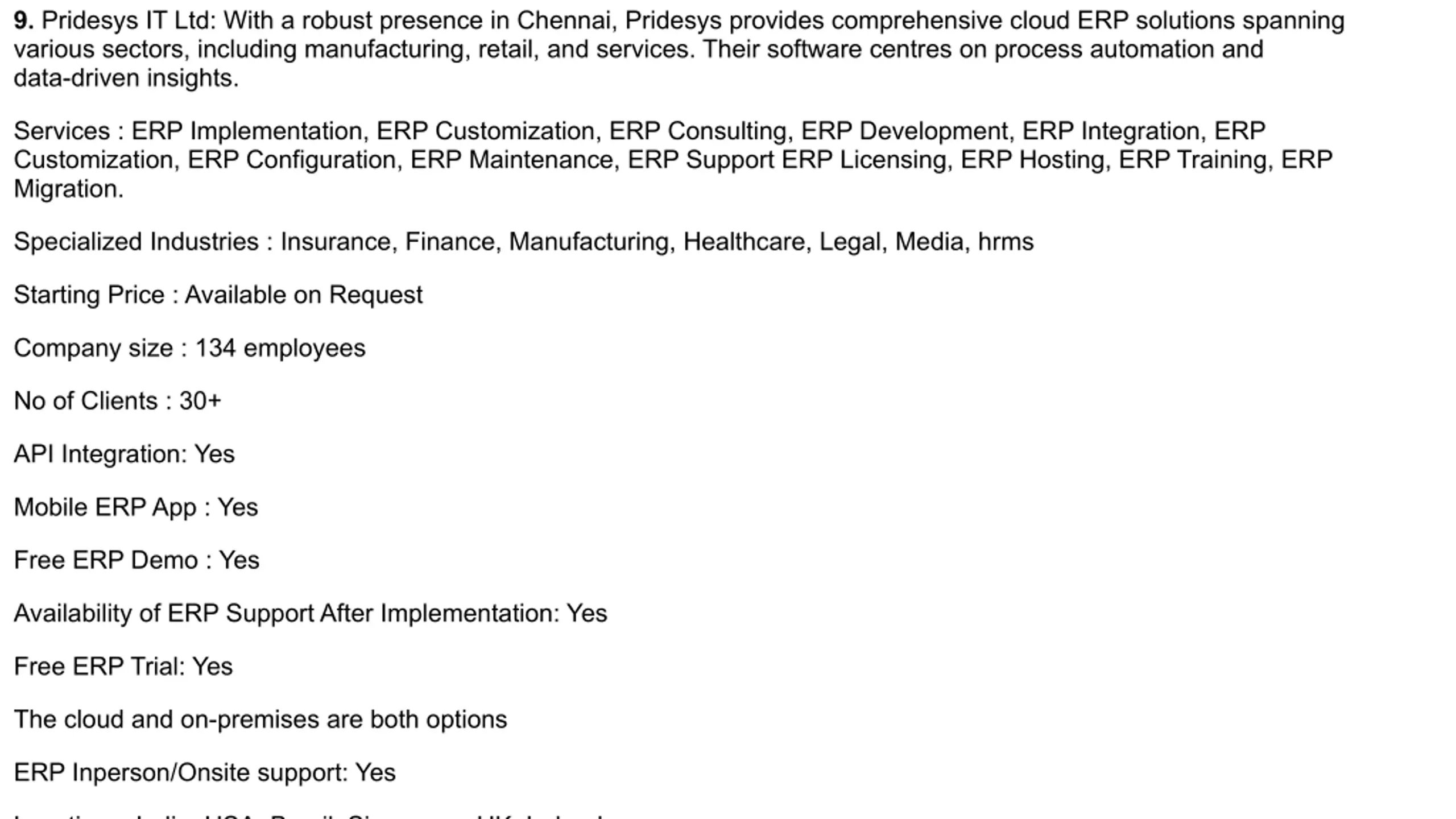 9. Pridesys IT Ltd: With a robust presence in Chennai, Pridesys provides comprehensive cloud ERP solutions spanning various sectors, including manufacturing, retail, and services. Their software centres on process automation and data-driven insights. Services : ERP Implementation, ERP Customization, ERP Consulting, ERP Development, ERP Integration, ERP Customization, ERP Configuration, ERP Maintenance, ERP Support ERP Licensing, ERP Hosting, ERP Training, ERP Migration. Specialized Industries : Insurance, Finance, Manufacturing, Healthcare, Legal, Media, hrms Starting Price : Available on Request Company size : 134 employees No of Clients : 30+ API Integration: Yes Mobile ERP App : Yes Free ERP Demo : Yes Availability of ERP Support After Implementation: Yes Free ERP Trial: Yes The cloud and on-premises are both options ERP Inperson/Onsite support: Yes Locations: India, USA, Brazil, Singapore, UK, Ireland Website: www.pridesysitltd.com ERP Inperson/Onsite support: Yes Locations: Chennai, Coimbatore, United Arab Emirates, and the United States