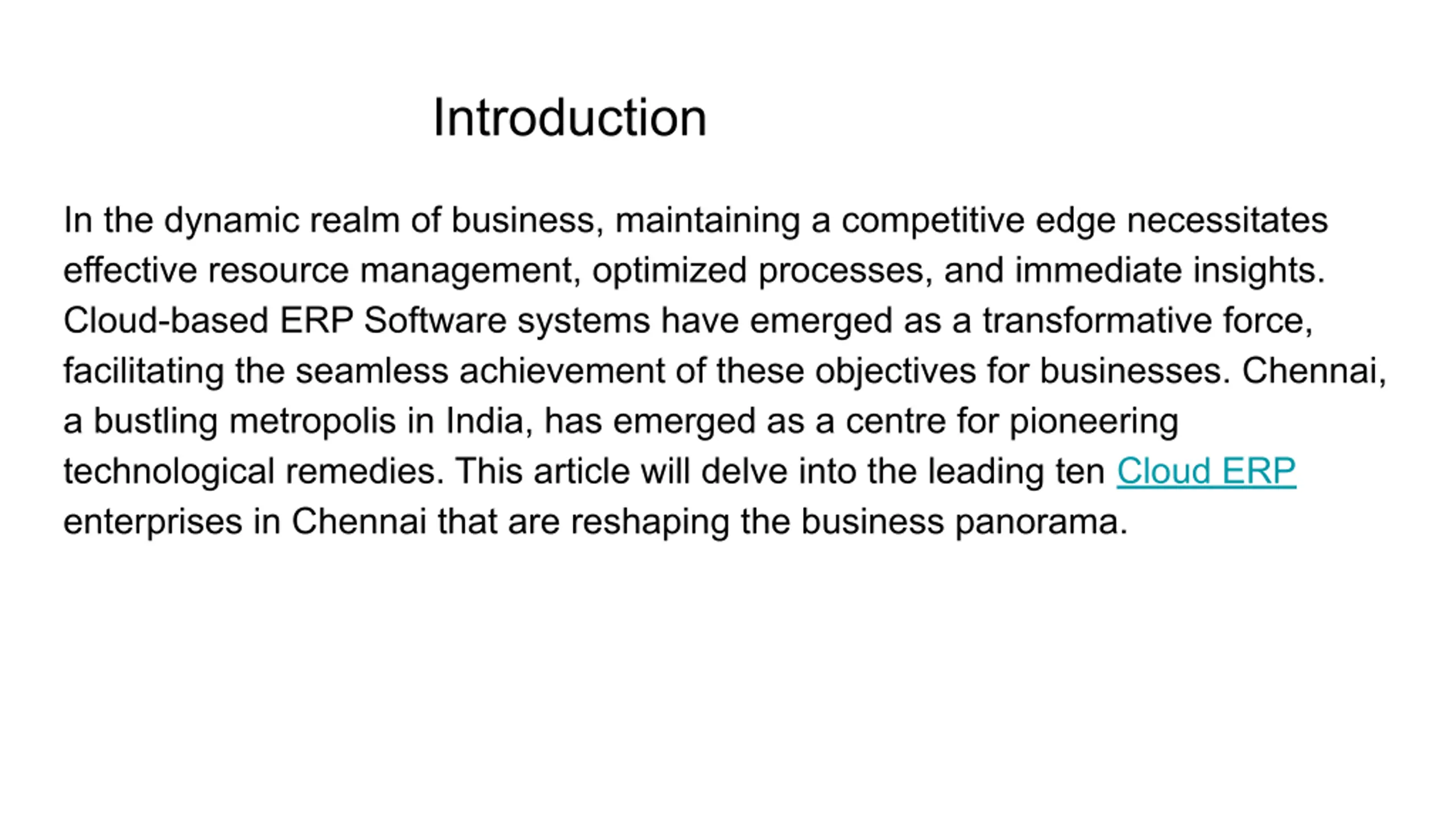 Introduction In the dynamic realm of business, maintaining a competitive edge necessitates effective resource management, optimized processes, and immediate insights. Cloud-based ERP Software systems have emerged as a transformative force, facilitating the seamless achievement of these objectives for businesses. Chennai, a bustling metropolis in India, has emerged as a centre for pioneering technological remedies. This article will delve into the leading ten Cloud ERP enterprises in Chennai that are reshaping the business panorama.