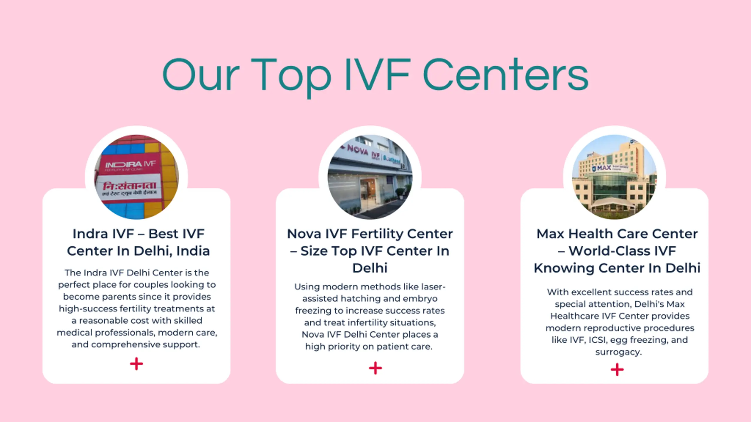 Our Top IVF Centers Indra IVF Best IVF Center In Delhi, India Nova IVF Fertility Center Size Top IVF Center In Delhi Max Health Care Center World-Class IVF Knowing Center In Delhi The Indra IVF Delhi Center is the perfect place for couples looking to become parents since it provides high-success fertility treatments at a reasonable cost with skilled medical professionals, modern care, and comprehensive support. Using modern methods like laser- assisted hatching and embryo freezing to increase success rates and treat infertility situations, Nova IVF Delhi Center places a high priority on patient care. With excellent success rates and special attention, Delhi's Max Healthcare IVF Center provides modern reproductive procedures like IVF, ICSI, egg freezing, and surrogacy.