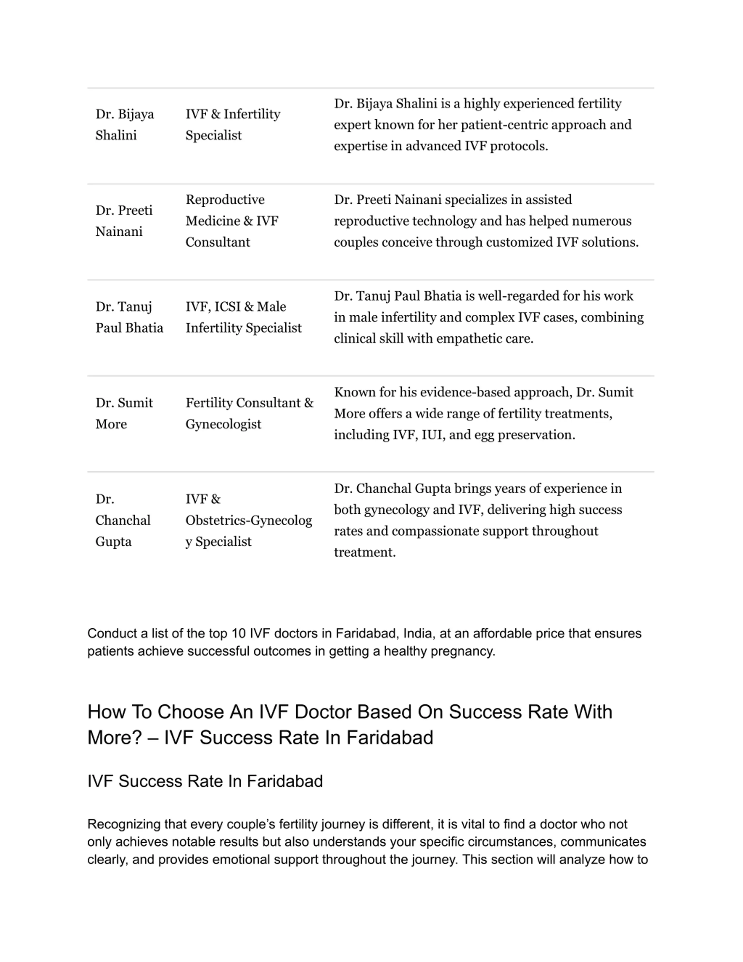 Dr. Bijaya Shalini is a highly experienced fertility expert known for her patient-centric approach and expertise in advanced IVF protocols. Dr. Bijaya Shalini IVF & Infertility Specialist Reproductive Medicine & IVF Consultant Dr. Preeti Nainani specializes in assisted reproductive technology and has helped numerous couples conceive through customized IVF solutions. Dr. Preeti Nainani Dr. Tanuj Paul Bhatia is well-regarded for his work in male infertility and complex IVF cases, combining clinical skill with empathetic care. Dr. Tanuj Paul Bhatia IVF, ICSI & Male Infertility Specialist Known for his evidence-based approach, Dr. Sumit More offers a wide range of fertility treatments, including IVF, IUI, and egg preservation. Dr. Sumit More Fertility Consultant & Gynecologist Dr. Chanchal Gupta brings years of experience in both gynecology and IVF, delivering high success rates and compassionate support throughout treatment. Dr. Chanchal Gupta IVF & Obstetrics-Gynecolog y Specialist Conduct a list of the top 10 IVF doctors in Faridabad, India, at an affordable price that ensures patients achieve successful outcomes in getting a healthy pregnancy. How To Choose An IVF Doctor Based On Success Rate With More? IVF Success Rate In Faridabad IVF Success Rate In Faridabad Recognizing that every couple s fertility journey is different, it is vital to find a doctor who not only achieves notable results but also understands your specific circumstances, communicates clearly, and provides emotional support throughout the journey. This section will analyze how to