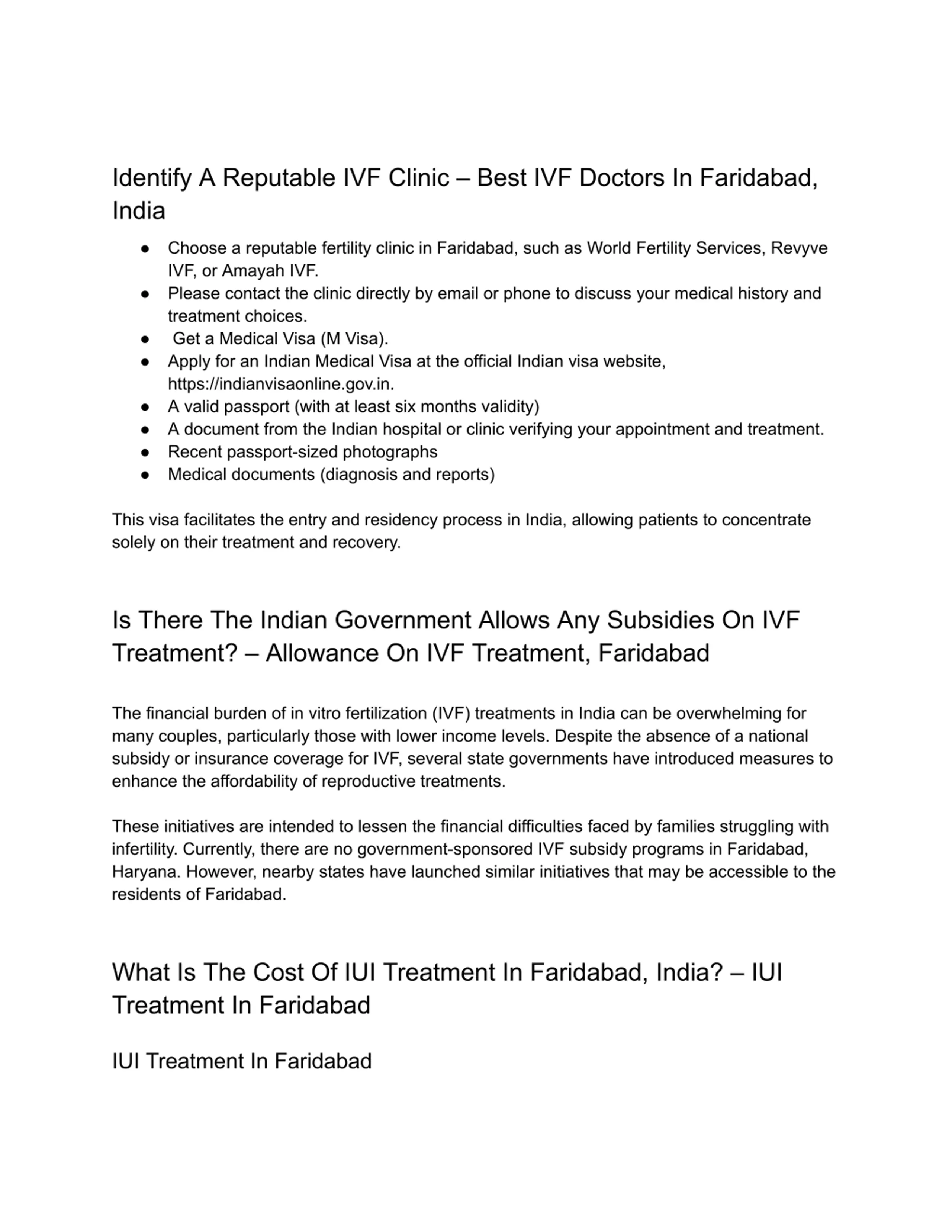 Identify A Reputable IVF Clinic Best IVF Doctors In Faridabad, India Choose a reputable fertility clinic in Faridabad, such as World Fertility Services, Revyve IVF, or Amayah IVF. Please contact the clinic directly by email or phone to discuss your medical history and treatment choices. Get a Medical Visa (M Visa). Apply for an Indian Medical Visa at the official Indian visa website, https://indianvisaonline.gov.in. A valid passport (with at least six months validity) A document from the Indian hospital or clinic verifying your appointment and treatment. Recent passport-sized photographs Medical documents (diagnosis and reports) This visa facilitates the entry and residency process in India, allowing patients to concentrate solely on their treatment and recovery. Is There The Indian Government Allows Any Subsidies On IVF Treatment? Allowance On IVF Treatment, Faridabad The financial burden of in vitro fertilization (IVF) treatments in India can be overwhelming for many couples, particularly those with lower income levels. Despite the absence of a national subsidy or insurance coverage for IVF, several state governments have introduced measures to enhance the affordability of reproductive treatments. These initiatives are intended to lessen the financial difficulties faced by families struggling with infertility. Currently, there are no government-sponsored IVF subsidy programs in Faridabad, Haryana. However, nearby states have launched similar initiatives that may be accessible to the residents of Faridabad. What Is The Cost Of IUI Treatment In Faridabad, India? IUI Treatment In Faridabad IUI Treatment In Faridabad