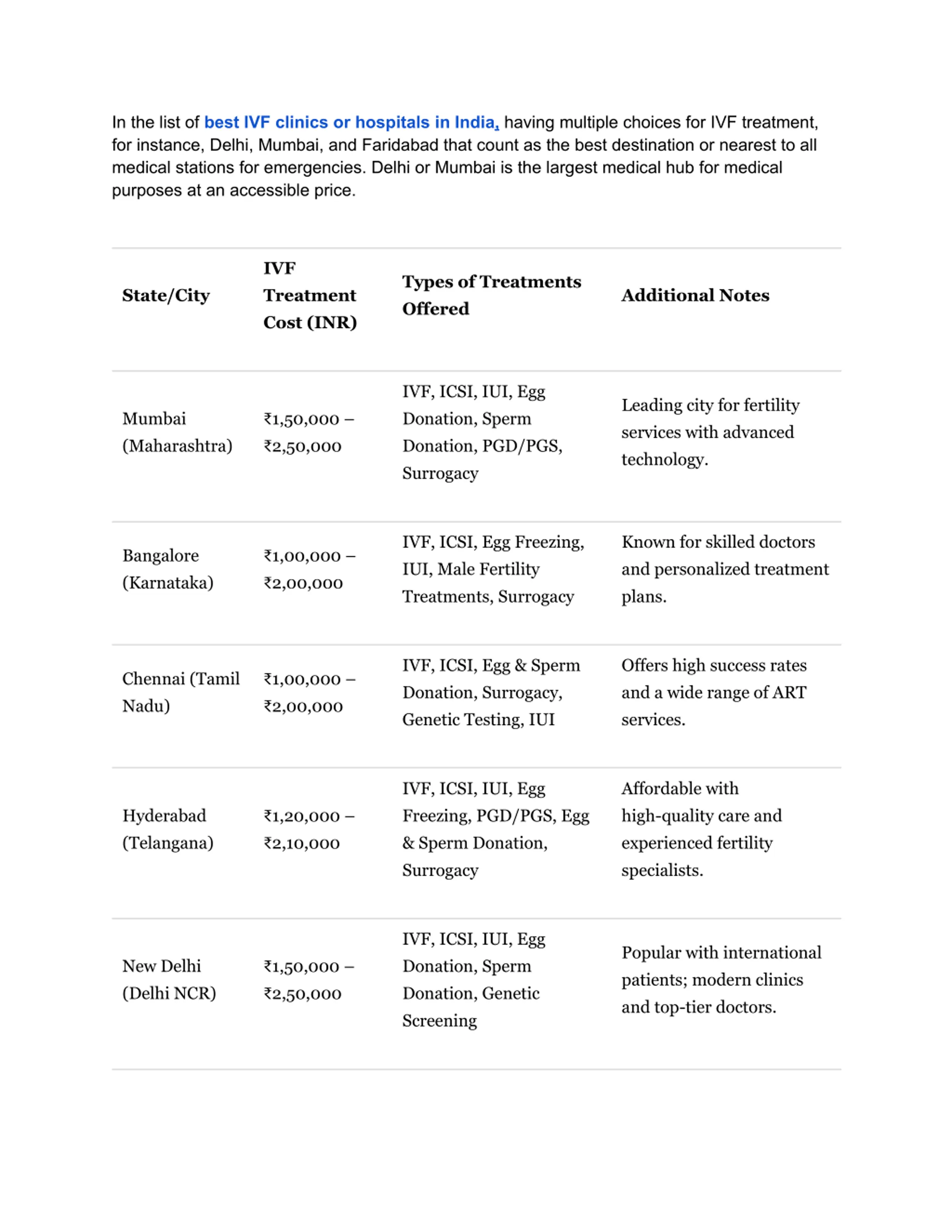 In the list of best IVF clinics or hospitals in India, having multiple choices for IVF treatment, for instance, Delhi, Mumbai, and Faridabad that count as the best destination or nearest to all medical stations for emergencies. Delhi or Mumbai is the largest medical hub for medical purposes at an accessible price. IVF Treatment Cost (INR) Types of Treatments Offered State/City Additional Notes IVF, ICSI, IUI, Egg Donation, Sperm Donation, PGD/PGS, Surrogacy Leading city for fertility services with advanced technology. Mumbai (Maharashtra) 1,50,000 2,50,000 IVF, ICSI, Egg Freezing, IUI, Male Fertility Treatments, Surrogacy Known for skilled doctors and personalized treatment plans. Bangalore (Karnataka) 1,00,000 2,00,000 IVF, ICSI, Egg & Sperm Donation, Surrogacy, Genetic Testing, IUI Offers high success rates and a wide range of ART services. Chennai (Tamil Nadu) 1,00,000 2,00,000 IVF, ICSI, IUI, Egg Freezing, PGD/PGS, Egg & Sperm Donation, Surrogacy Affordable with high-quality care and experienced fertility specialists. Hyderabad (Telangana) 1,20,000 2,10,000 IVF, ICSI, IUI, Egg Donation, Sperm Donation, Genetic Screening Popular with international patients; modern clinics and top-tier doctors. New Delhi (Delhi NCR) 1,50,000 2,50,000