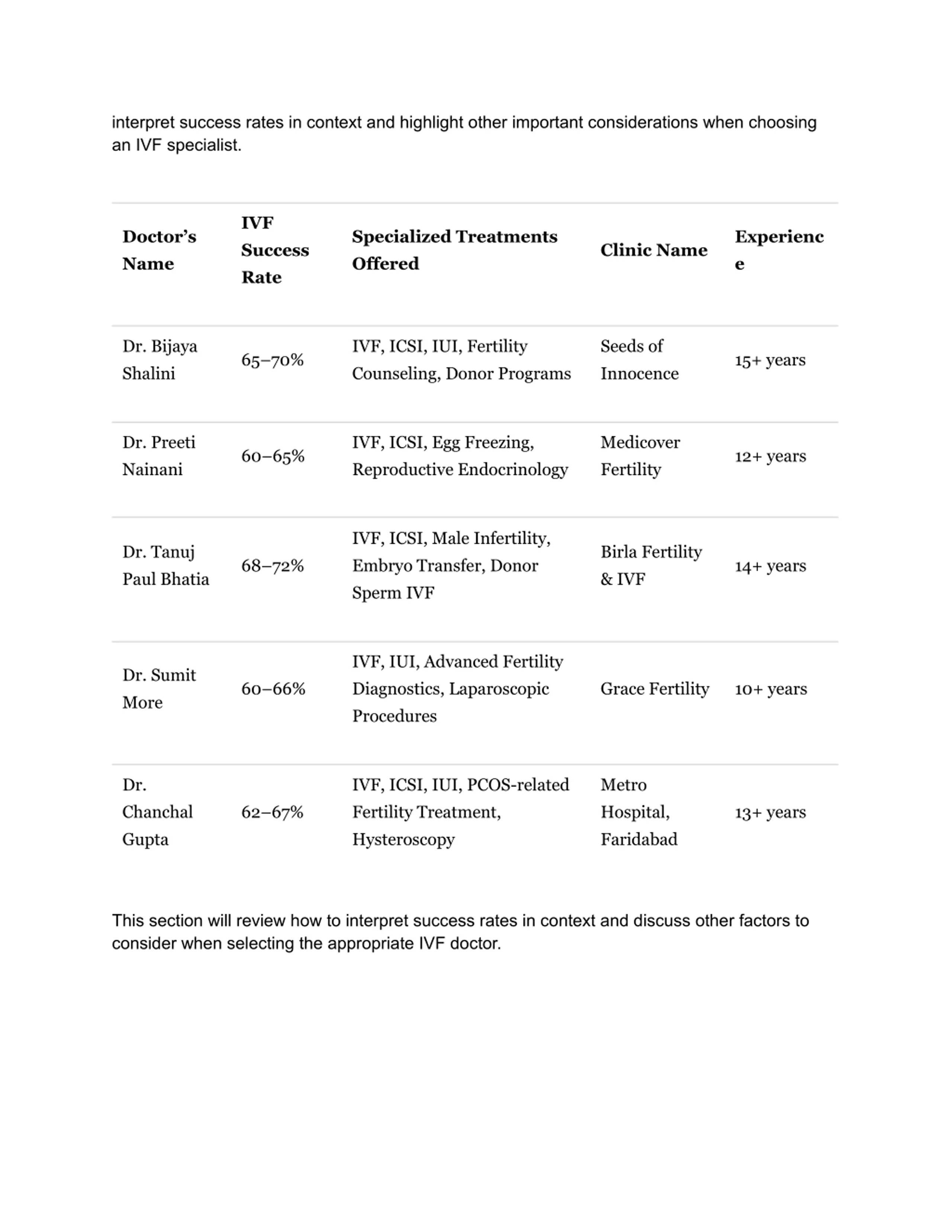 interpret success rates in context and highlight other important considerations when choosing an IVF specialist. IVF Success Rate Doctor s Name Specialized Treatments Offered Experienc e Clinic Name Dr. Bijaya Shalini IVF, ICSI, IUI, Fertility Counseling, Donor Programs Seeds of Innocence 65 70% 15+ years Dr. Preeti Nainani IVF, ICSI, Egg Freezing, Reproductive Endocrinology Medicover Fertility 60 65% 12+ years IVF, ICSI, Male Infertility, Embryo Transfer, Donor Sperm IVF Dr. Tanuj Paul Bhatia Birla Fertility & IVF 68 72% 14+ years IVF, IUI, Advanced Fertility Diagnostics, Laparoscopic Procedures Dr. Sumit More 60 66% Grace Fertility 10+ years Dr. Chanchal Gupta IVF, ICSI, IUI, PCOS-related Fertility Treatment, Hysteroscopy Metro Hospital, Faridabad 62 67% 13+ years This section will review how to interpret success rates in context and discuss other factors to consider when selecting the appropriate IVF doctor.