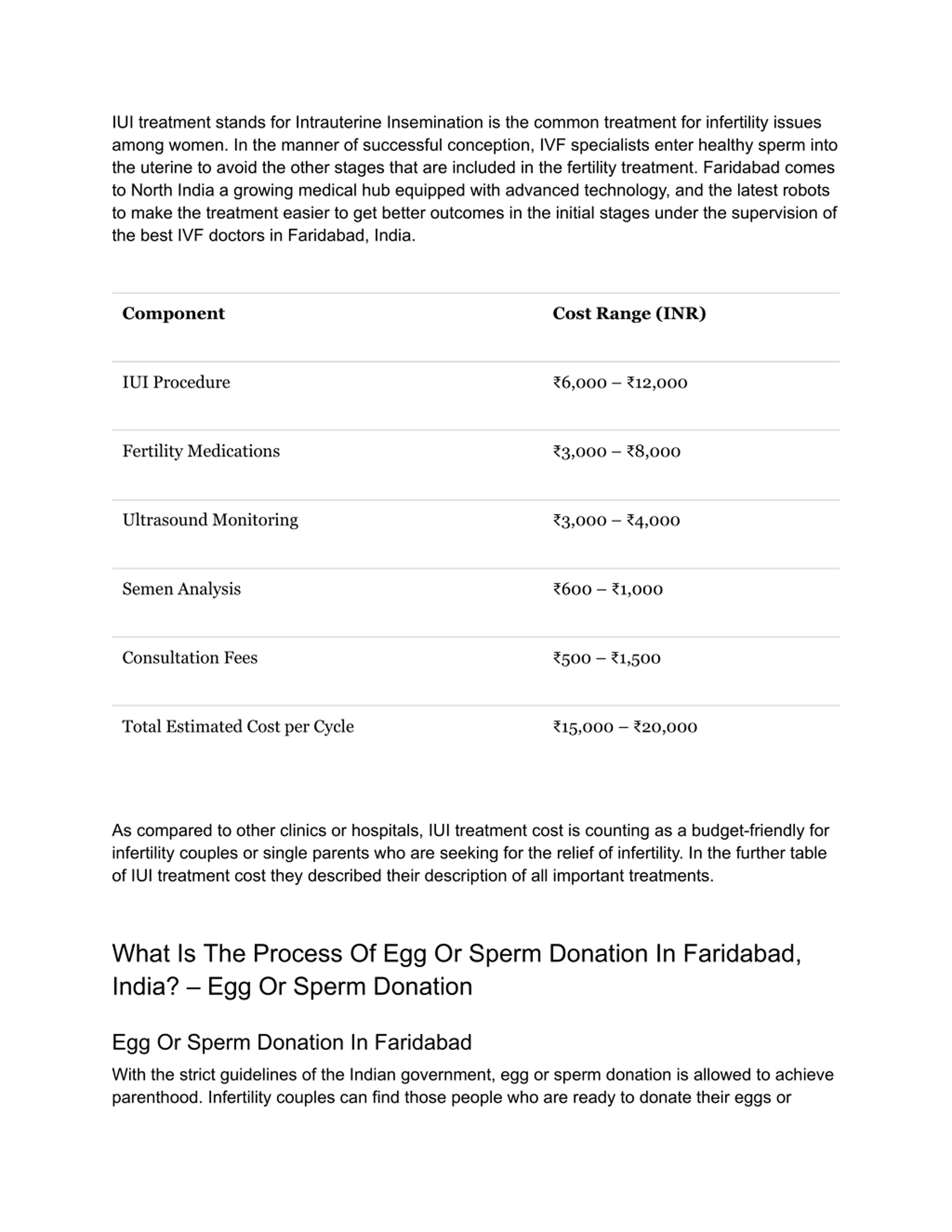 IUI treatment stands for Intrauterine Insemination is the common treatment for infertility issues among women. In the manner of successful conception, IVF specialists enter healthy sperm into the uterine to avoid the other stages that are included in the fertility treatment. Faridabad comes to North India a growing medical hub equipped with advanced technology, and the latest robots to make the treatment easier to get better outcomes in the initial stages under the supervision of the best IVF doctors in Faridabad, India. Component Cost Range (INR) IUI Procedure 6,000 12,000 Fertility Medications 3,000 8,000 Ultrasound Monitoring 3,000 4,000 Semen Analysis 600 1,000 Consultation Fees 500 1,500 Total Estimated Cost per Cycle 15,000 20,000 As compared to other clinics or hospitals, IUI treatment cost is counting as a budget-friendly for infertility couples or single parents who are seeking for the relief of infertility. In the further table of IUI treatment cost they described their description of all important treatments. What Is The Process Of Egg Or Sperm Donation In Faridabad, India? Egg Or Sperm Donation Egg Or Sperm Donation In Faridabad With the strict guidelines of the Indian government, egg or sperm donation is allowed to achieve parenthood. Infertility couples can find those people who are ready to donate their eggs or
