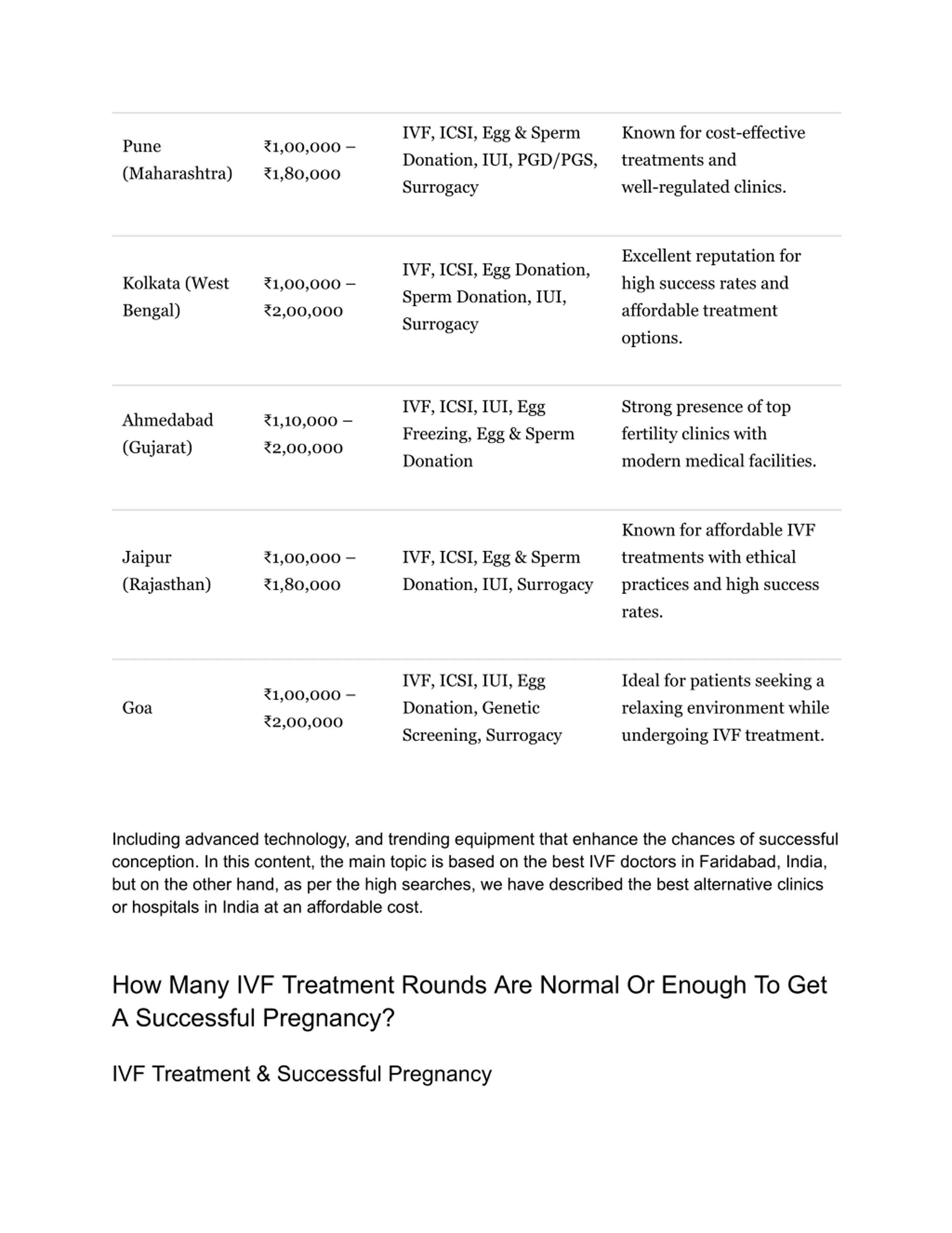 IVF, ICSI, Egg & Sperm Donation, IUI, PGD/PGS, Surrogacy Known for cost-effective treatments and well-regulated clinics. Pune (Maharashtra) 1,00,000 1,80,000 Excellent reputation for high success rates and affordable treatment options. IVF, ICSI, Egg Donation, Sperm Donation, IUI, Surrogacy Kolkata (West Bengal) 1,00,000 2,00,000 IVF, ICSI, IUI, Egg Freezing, Egg & Sperm Donation Strong presence of top fertility clinics with modern medical facilities. Ahmedabad (Gujarat) 1,10,000 2,00,000 Known for affordable IVF treatments with ethical practices and high success rates. Jaipur (Rajasthan) 1,00,000 1,80,000 IVF, ICSI, Egg & Sperm Donation, IUI, Surrogacy IVF, ICSI, IUI, Egg Donation, Genetic Screening, Surrogacy Ideal for patients seeking a relaxing environment while undergoing IVF treatment. 1,00,000 2,00,000 Goa Including advanced technology, and trending equipment that enhance the chances of successful conception. In this content, the main topic is based on the best IVF doctors in Faridabad, India, but on the other hand, as per the high searches, we have described the best alternative clinics or hospitals in India at an affordable cost. How Many IVF Treatment Rounds Are Normal Or Enough To Get A Successful Pregnancy? IVF Treatment & Successful Pregnancy
