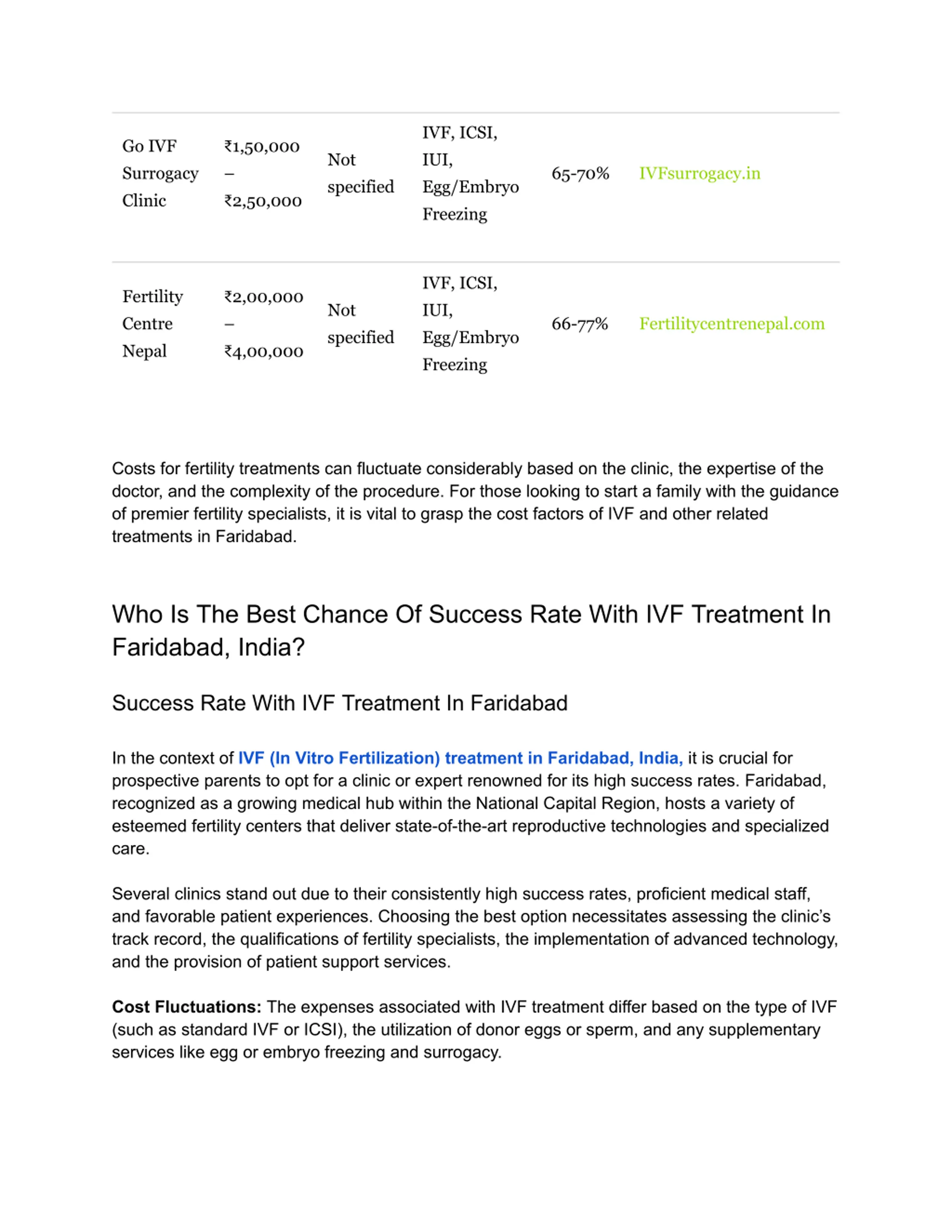 IVF, ICSI, IUI, Egg/Embryo Freezing Go IVF Surrogacy Clinic 1,50,000 2,50,000 Not specified 65-70% IVFsurrogacy.in IVF, ICSI, IUI, Egg/Embryo Freezing Fertility Centre Nepal 2,00,000 4,00,000 Not specified 66-77% Fertilitycentrenepal.com Costs for fertility treatments can fluctuate considerably based on the clinic, the expertise of the doctor, and the complexity of the procedure. For those looking to start a family with the guidance of premier fertility specialists, it is vital to grasp the cost factors of IVF and other related treatments in Faridabad. Who Is The Best Chance Of Success Rate With IVF Treatment In Faridabad, India? Success Rate With IVF Treatment In Faridabad In the context of IVF (In Vitro Fertilization) treatment in Faridabad, India, it is crucial for prospective parents to opt for a clinic or expert renowned for its high success rates. Faridabad, recognized as a growing medical hub within the National Capital Region, hosts a variety of esteemed fertility centers that deliver state-of-the-art reproductive technologies and specialized care. Several clinics stand out due to their consistently high success rates, proficient medical staff, and favorable patient experiences. Choosing the best option necessitates assessing the clinic s track record, the qualifications of fertility specialists, the implementation of advanced technology, and the provision of patient support services. Cost Fluctuations: The expenses associated with IVF treatment differ based on the type of IVF (such as standard IVF or ICSI), the utilization of donor eggs or sperm, and any supplementary services like egg or embryo freezing and surrogacy.