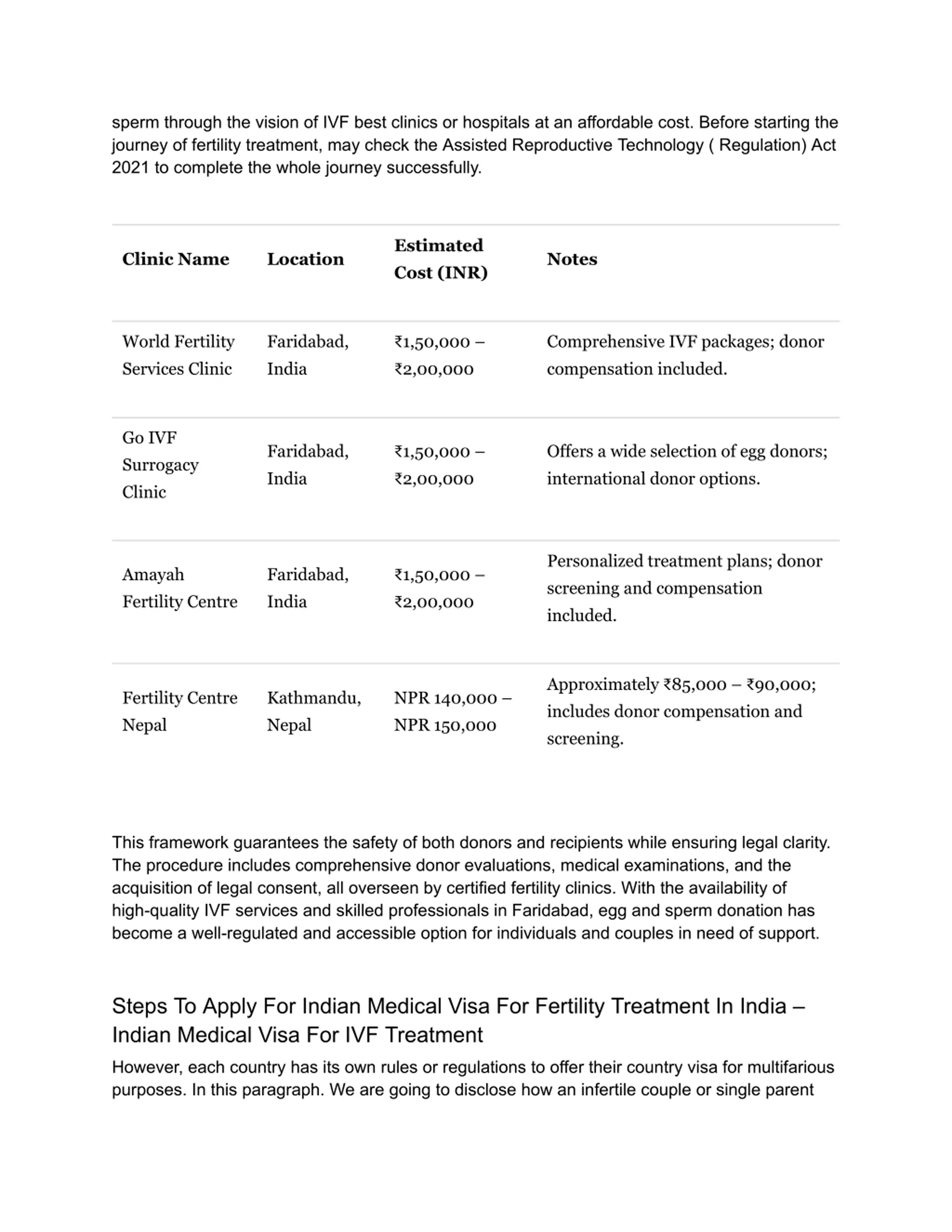 sperm through the vision of IVF best clinics or hospitals at an affordable cost. Before starting the journey of fertility treatment, may check the Assisted Reproductive Technology ( Regulation) Act 2021 to complete the whole journey successfully. Estimated Cost (INR) Clinic Name Location Notes World Fertility Services Clinic Faridabad, India 1,50,000 2,00,000 Comprehensive IVF packages; donor compensation included. Go IVF Surrogacy Clinic Faridabad, India 1,50,000 2,00,000 Offers a wide selection of egg donors; international donor options. Personalized treatment plans; donor screening and compensation included. Amayah Fertility Centre Faridabad, India 1,50,000 2,00,000 Approximately 85,000 90,000; includes donor compensation and screening. Fertility Centre Nepal Kathmandu, Nepal NPR 140,000 NPR 150,000 This framework guarantees the safety of both donors and recipients while ensuring legal clarity. The procedure includes comprehensive donor evaluations, medical examinations, and the acquisition of legal consent, all overseen by certified fertility clinics. With the availability of high-quality IVF services and skilled professionals in Faridabad, egg and sperm donation has become a well-regulated and accessible option for individuals and couples in need of support. Steps To Apply For Indian Medical Visa For Fertility Treatment In India Indian Medical Visa For IVF Treatment However, each country has its own rules or regulations to offer their country visa for multifarious purposes. In this paragraph. We are going to disclose how an infertile couple or single parent
