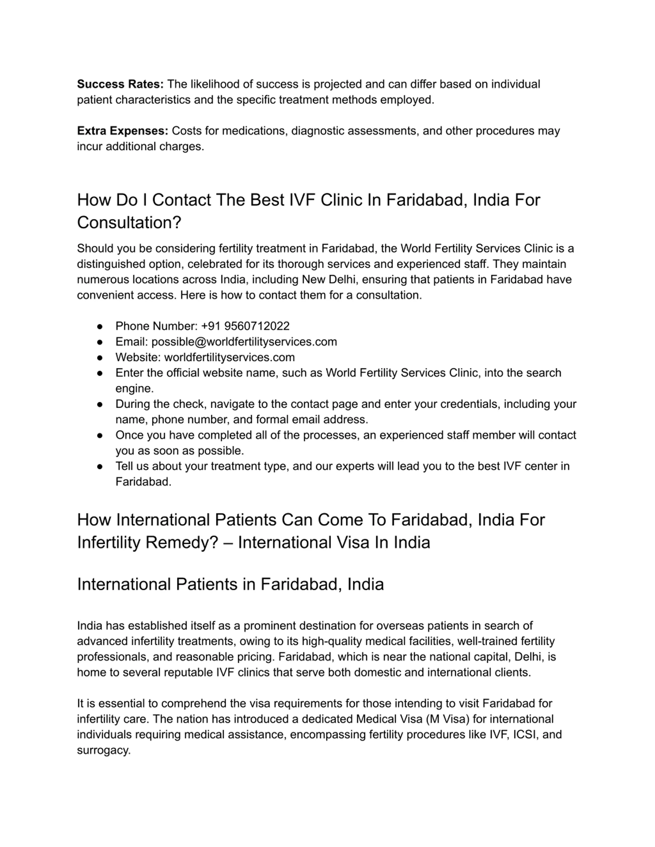 Success Rates: The likelihood of success is projected and can differ based on individual patient characteristics and the specific treatment methods employed. Extra Expenses: Costs for medications, diagnostic assessments, and other procedures may incur additional charges. How Do I Contact The Best IVF Clinic In Faridabad, India For Consultation? Should you be considering fertility treatment in Faridabad, the World Fertility Services Clinic is a distinguished option, celebrated for its thorough services and experienced staff. They maintain numerous locations across India, including New Delhi, ensuring that patients in Faridabad have convenient access. Here is how to contact them for a consultation. Phone Number: +91 9560712022 Email: possible@worldfertilityservices.com Website: worldfertilityservices.com Enter the official website name, such as World Fertility Services Clinic, into the search engine. During the check, navigate to the contact page and enter your credentials, including your name, phone number, and formal email address. Once you have completed all of the processes, an experienced staff member will contact you as soon as possible. Tell us about your treatment type, and our experts will lead you to the best IVF center in Faridabad. How International Patients Can Come To Faridabad, India For Infertility Remedy? International Visa In India International Patients in Faridabad, India India has established itself as a prominent destination for overseas patients in search of advanced infertility treatments, owing to its high-quality medical facilities, well-trained fertility professionals, and reasonable pricing. Faridabad, which is near the national capital, Delhi, is home to several reputable IVF clinics that serve both domestic and international clients. It is essential to comprehend the visa requirements for those intending to visit Faridabad for infertility care. The nation has introduced a dedicated Medical Visa (M Visa) for international individuals requiring medical assistance, encompassing fertility procedures like IVF, ICSI, and surrogacy.
