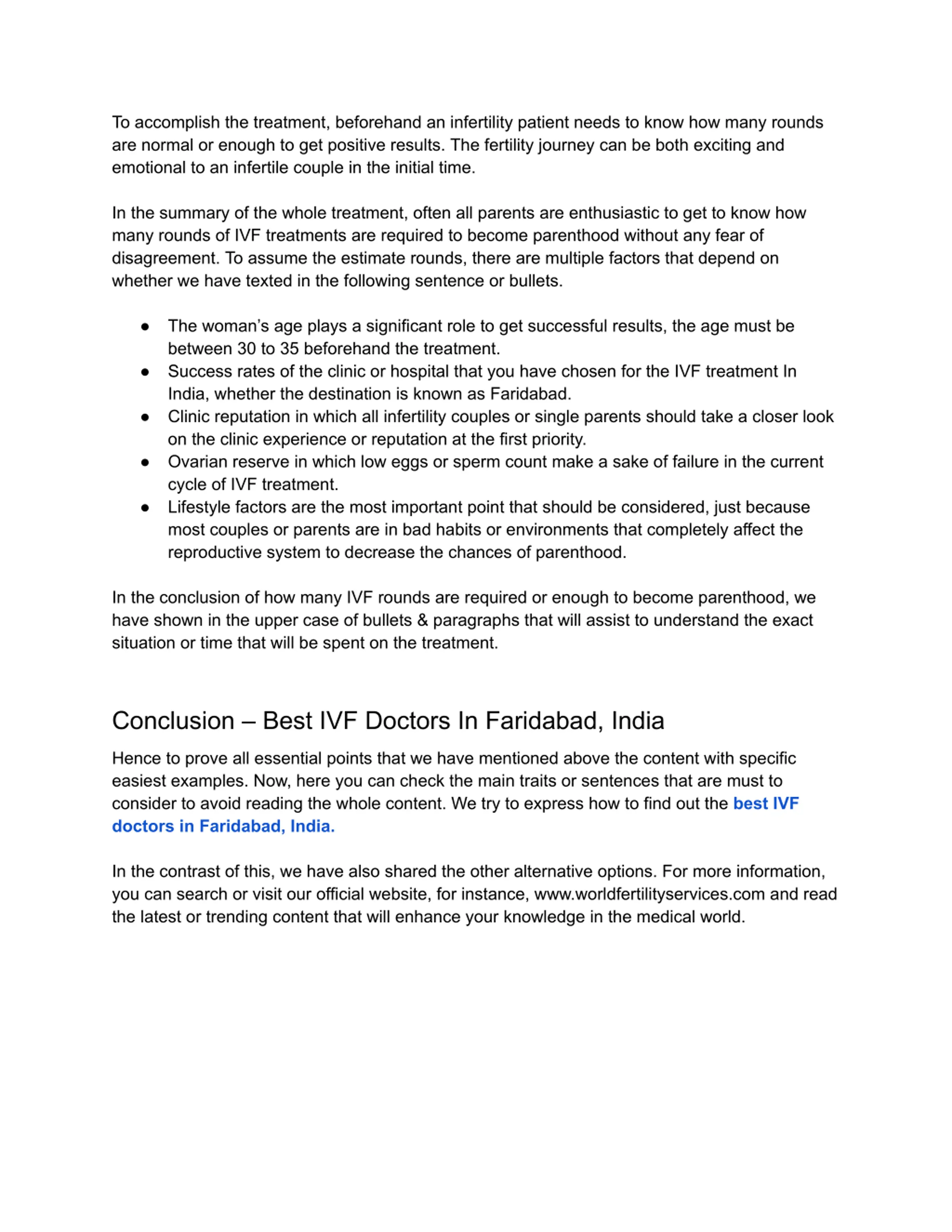To accomplish the treatment, beforehand an infertility patient needs to know how many rounds are normal or enough to get positive results. The fertility journey can be both exciting and emotional to an infertile couple in the initial time. In the summary of the whole treatment, often all parents are enthusiastic to get to know how many rounds of IVF treatments are required to become parenthood without any fear of disagreement. To assume the estimate rounds, there are multiple factors that depend on whether we have texted in the following sentence or bullets. The woman s age plays a significant role to get successful results, the age must be between 30 to 35 beforehand the treatment. Success rates of the clinic or hospital that you have chosen for the IVF treatment In India, whether the destination is known as Faridabad. Clinic reputation in which all infertility couples or single parents should take a closer look on the clinic experience or reputation at the first priority. Ovarian reserve in which low eggs or sperm count make a sake of failure in the current cycle of IVF treatment. Lifestyle factors are the most important point that should be considered, just because most couples or parents are in bad habits or environments that completely affect the reproductive system to decrease the chances of parenthood. In the conclusion of how many IVF rounds are required or enough to become parenthood, we have shown in the upper case of bullets & paragraphs that will assist to understand the exact situation or time that will be spent on the treatment. Conclusion Best IVF Doctors In Faridabad, India Hence to prove all essential points that we have mentioned above the content with specific easiest examples. Now, here you can check the main traits or sentences that are must to consider to avoid reading the whole content. We try to express how to find out the best IVF doctors in Faridabad, India. In the contrast of this, we have also shared the other alternative options. For more information, you can search or visit our official website, for instance, www.worldfertilityservices.com and read the latest or trending content that will enhance your knowledge in the medical world.