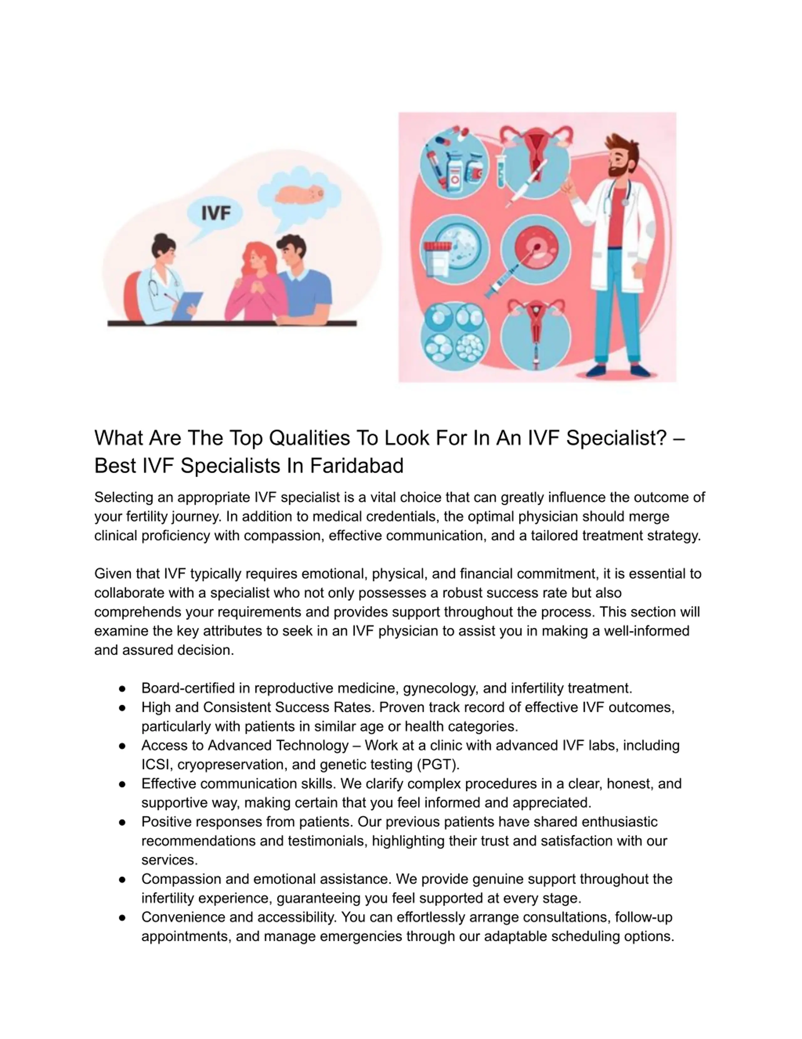 What Are The Top Qualities To Look For In An IVF Specialist? Best IVF Specialists In Faridabad Selecting an appropriate IVF specialist is a vital choice that can greatly influence the outcome of your fertility journey. In addition to medical credentials, the optimal physician should merge clinical proficiency with compassion, effective communication, and a tailored treatment strategy. Given that IVF typically requires emotional, physical, and financial commitment, it is essential to collaborate with a specialist who not only possesses a robust success rate but also comprehends your requirements and provides support throughout the process. This section will examine the key attributes to seek in an IVF physician to assist you in making a well-informed and assured decision. Board-certified in reproductive medicine, gynecology, and infertility treatment. High and Consistent Success Rates. Proven track record of effective IVF outcomes, particularly with patients in similar age or health categories. Access to Advanced Technology Work at a clinic with advanced IVF labs, including ICSI, cryopreservation, and genetic testing (PGT). Effective communication skills. We clarify complex procedures in a clear, honest, and supportive way, making certain that you feel informed and appreciated. Positive responses from patients. Our previous patients have shared enthusiastic recommendations and testimonials, highlighting their trust and satisfaction with our services. Compassion and emotional assistance. We provide genuine support throughout the infertility experience, guaranteeing you feel supported at every stage. Convenience and accessibility. You can effortlessly arrange consultations, follow-up appointments, and manage emergencies through our adaptable scheduling options.