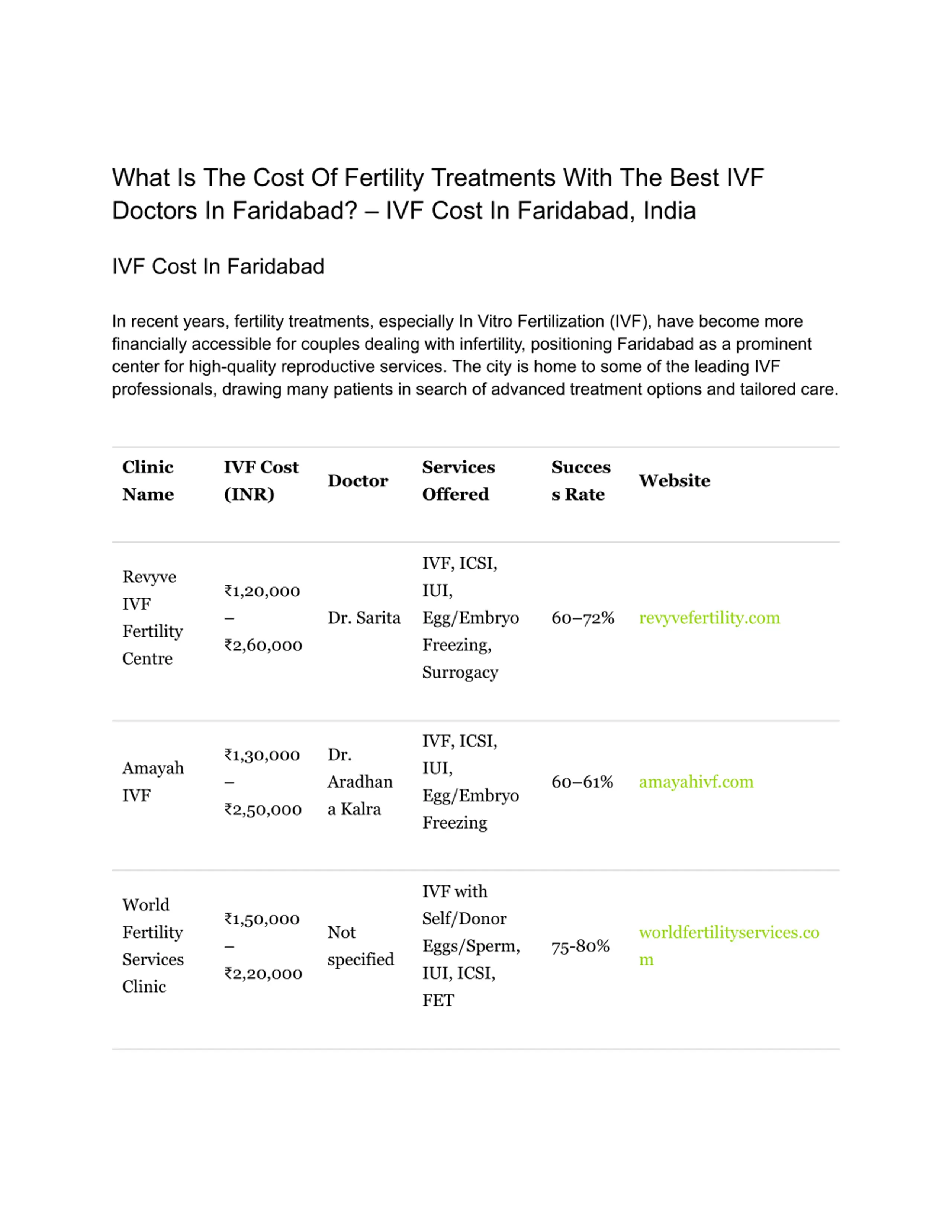 What Is The Cost Of Fertility Treatments With The Best IVF Doctors In Faridabad? IVF Cost In Faridabad, India IVF Cost In Faridabad In recent years, fertility treatments, especially In Vitro Fertilization (IVF), have become more financially accessible for couples dealing with infertility, positioning Faridabad as a prominent center for high-quality reproductive services. The city is home to some of the leading IVF professionals, drawing many patients in search of advanced treatment options and tailored care. Clinic Name IVF Cost (INR) Services Offered Succes s Rate Doctor Website IVF, ICSI, IUI, Egg/Embryo Freezing, Surrogacy Revyve IVF Fertility Centre 1,20,000 2,60,000 Dr. Sarita 60 72% revyvefertility.com IVF, ICSI, IUI, Egg/Embryo Freezing 1,30,000 2,50,000 Dr. Aradhan a Kalra Amayah IVF 60 61% amayahivf.com IVF with Self/Donor Eggs/Sperm, IUI, ICSI, FET World Fertility Services Clinic 1,50,000 2,20,000 Not specified worldfertilityservices.co m 75-80%