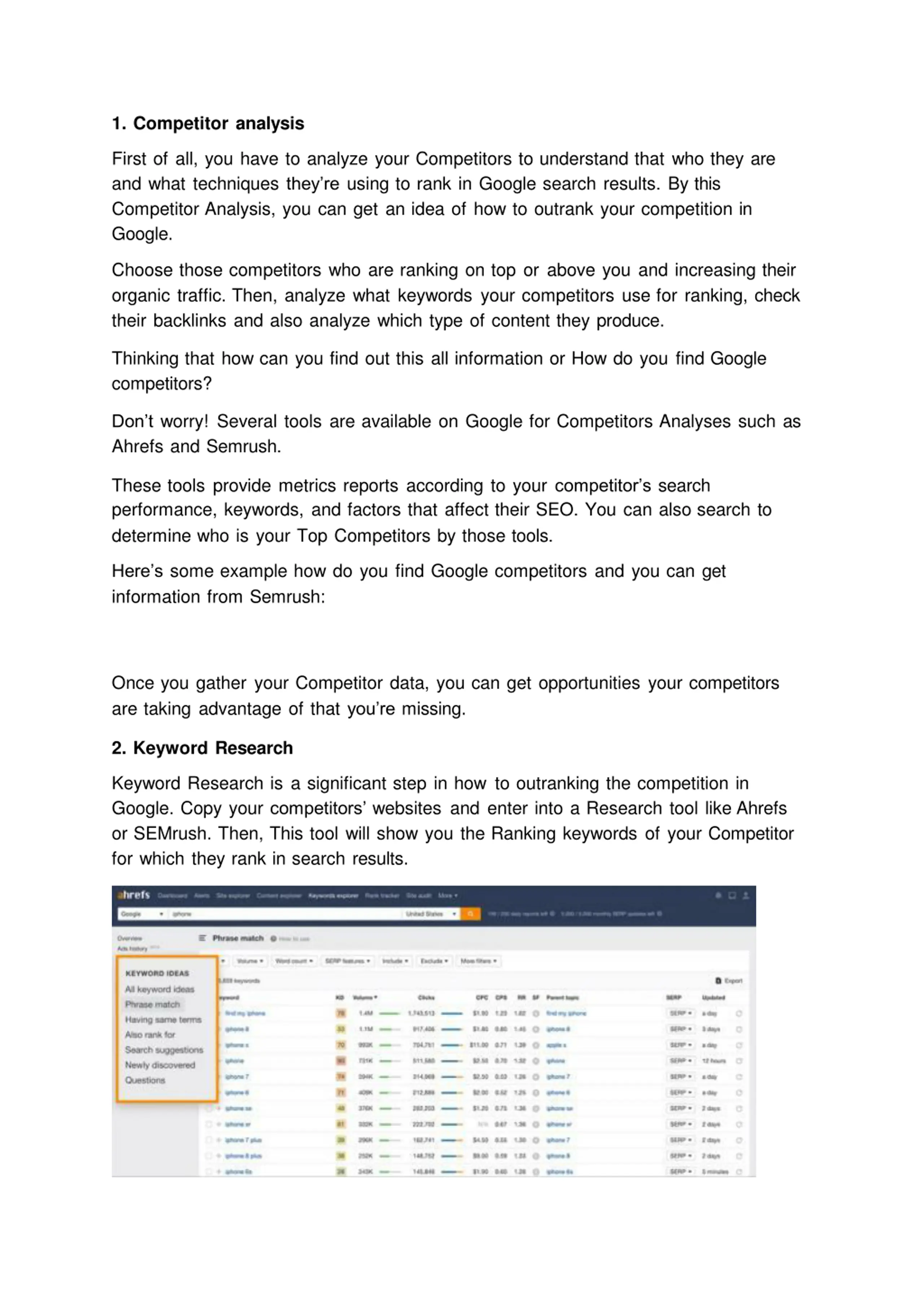 1. Competitor analysis First of all, you have to analyze your Competitors to understand that who they are and what techniques they re using to rank in Google search results. By this Competitor Analysis, you can get an idea of how to outrank your competition in Google. Choose those competitors who are ranking on top or above you and increasing their organic traffic. Then, analyze what keywords your competitors use for ranking, check their backlinks and also analyze which type of content they produce. Thinking that how can you find out this all information or How do you find Google competitors? Don t worry! Several tools are available on Google for Competitors Analyses such as Ahrefs and Semrush. These tools provide metrics reports according to your competitor s search performance, keywords, and factors that affect their SEO. You can also search to determine who is your Top Competitors by those tools. Here s some example how do you find Google competitors and you can get information from Semrush: Once you gather your Competitor data, you can get opportunities your competitors are taking advantage of that you re missing. 2. Keyword Research Keyword Research is a significant step in how to outranking the competition in Google. Copy your competitors websites and enter into a Research tool like Ahrefs or SEMrush. Then, This tool will show you the Ranking keywords of your Competitor for which they rank in search results.