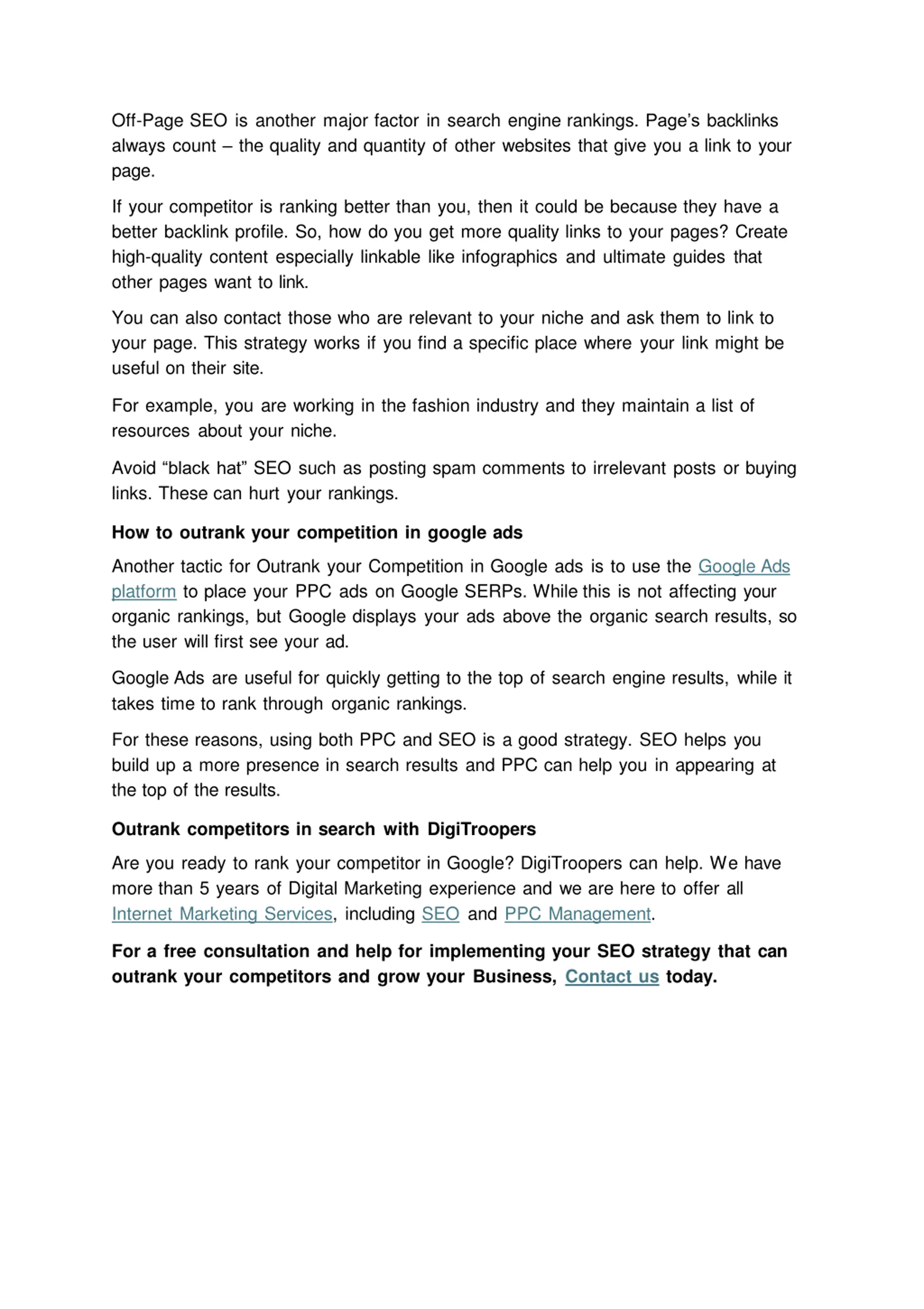 Off-Page SEO is another major factor in search engine rankings. Pages backlinks always count the quality and quantity of other websites that give you a link to your page. If your competitor is ranking better than you, then it could be because they have a better backlink profile. So, how do you get more quality links to your pages? Create high-quality content especially linkable like infographics and ultimate guides that other pages want to link. You can also contact those who are relevant to your niche and ask them to link to your page. This strategy works if you find a specific place where your link might be useful on their site. For example, you are working in the fashion industry and they maintain a list of resources about your niche. Avoid blackhat SEO such as posting spam comments to irrelevant posts or buying links. These can hurt your rankings. How to outrank your competition in google ads Another tactic for Outrank your Competition in Google ads is to use the Google Ads platform to place your PPC ads on Google SERPs. While this is not affecting your organic rankings, but Google displays your ads above the organic search results, so the user will first see your ad. Google Ads are useful for quickly getting to the top of search engine results, while it takes time to rank through organic rankings. For these reasons, using both PPC and SEO is a good strategy. SEO helps you build up a more presence in search results and PPC can help you in appearing at the top of the results. Outrank competitors in search with DigiTroopers Are you ready to rank your competitor in Google? DigiTroopers can help. We have more than 5 years of Digital Marketing experience and we are here to offer all Internet Marketing Services, including SEO and PPC Management. For a free consultation and help for implementing your SEO strategy that can outrank your competitors and grow your Business, Contact us today.