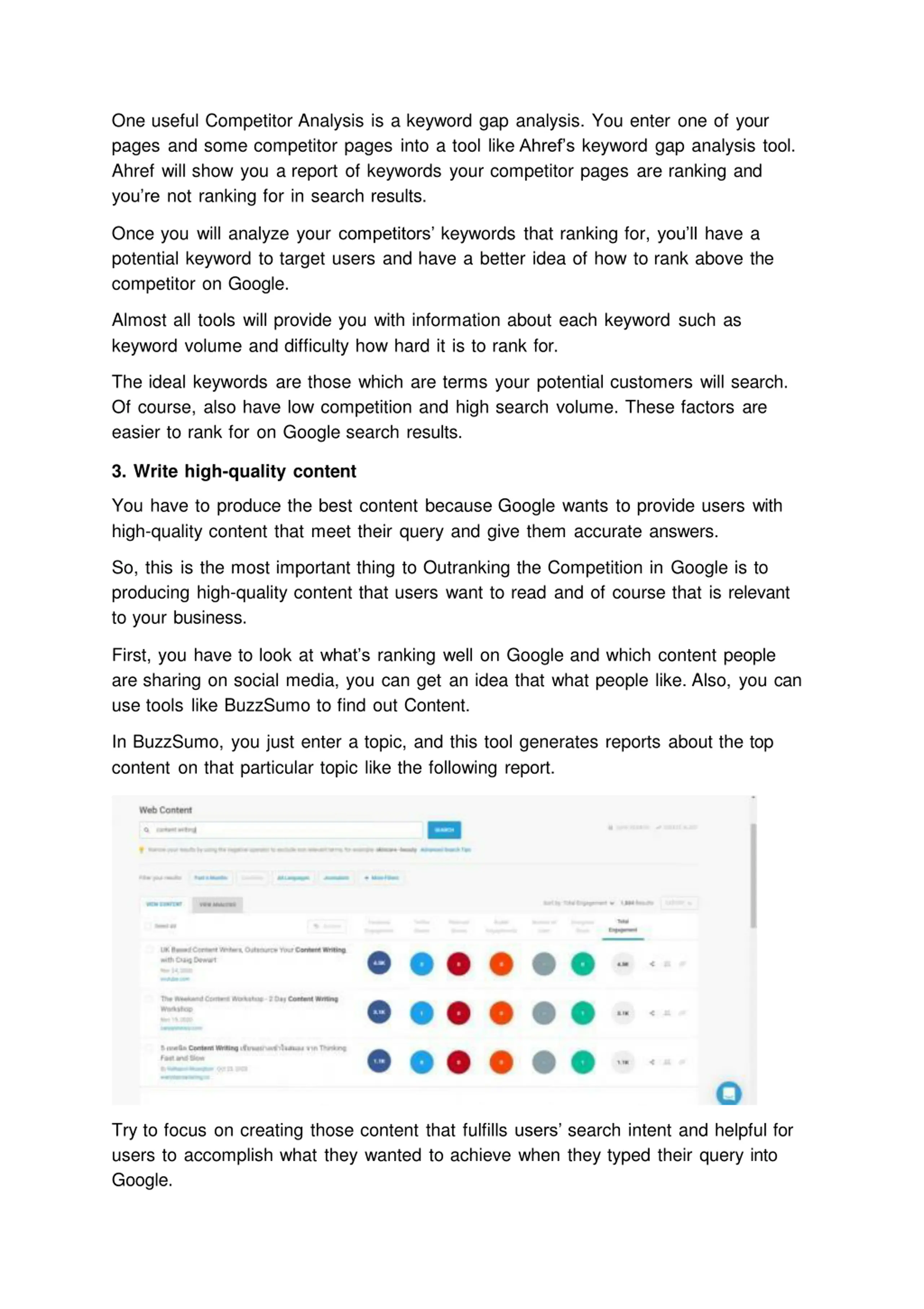 One useful Competitor Analysis is a keyword gap analysis. You enter one of your pages and some competitor pages into a tool like Ahref s keyword gap analysis tool. Ahref will show you a report of keywords your competitor pages are ranking and you re not ranking for in search results. Once you will analyze your competitors keywords that ranking for, you ll have a potential keyword to target users and have a better idea of how to rank above the competitor on Google. Almost all tools will provide you with information about each keyword such as keyword volume and difficulty how hard it is to rank for. The ideal keywords are those which are terms your potential customers will search. Of course, also have low competition and high search volume. These factors are easier to rank for on Google search results. 3. Write high-quality content You have to produce the best content because Google wants to provide users with high-quality content that meet their query and give them accurate answers. So, this is the most important thing to Outranking the Competition in Google is to producing high-quality content that users want to read and of course that is relevant to your business. First, you have to look at what s ranking well on Google and which content people are sharing on social media, you can get an idea that what people like. Also, you can use tools like BuzzSumo to find out Content. In BuzzSumo, you just enter a topic, and this tool generates reports about the top content on that particular topic like the following report. Try to focus on creating those content that fulfills users search intent and helpful for users to accomplish what they wanted to achieve when they typed their query into Google.