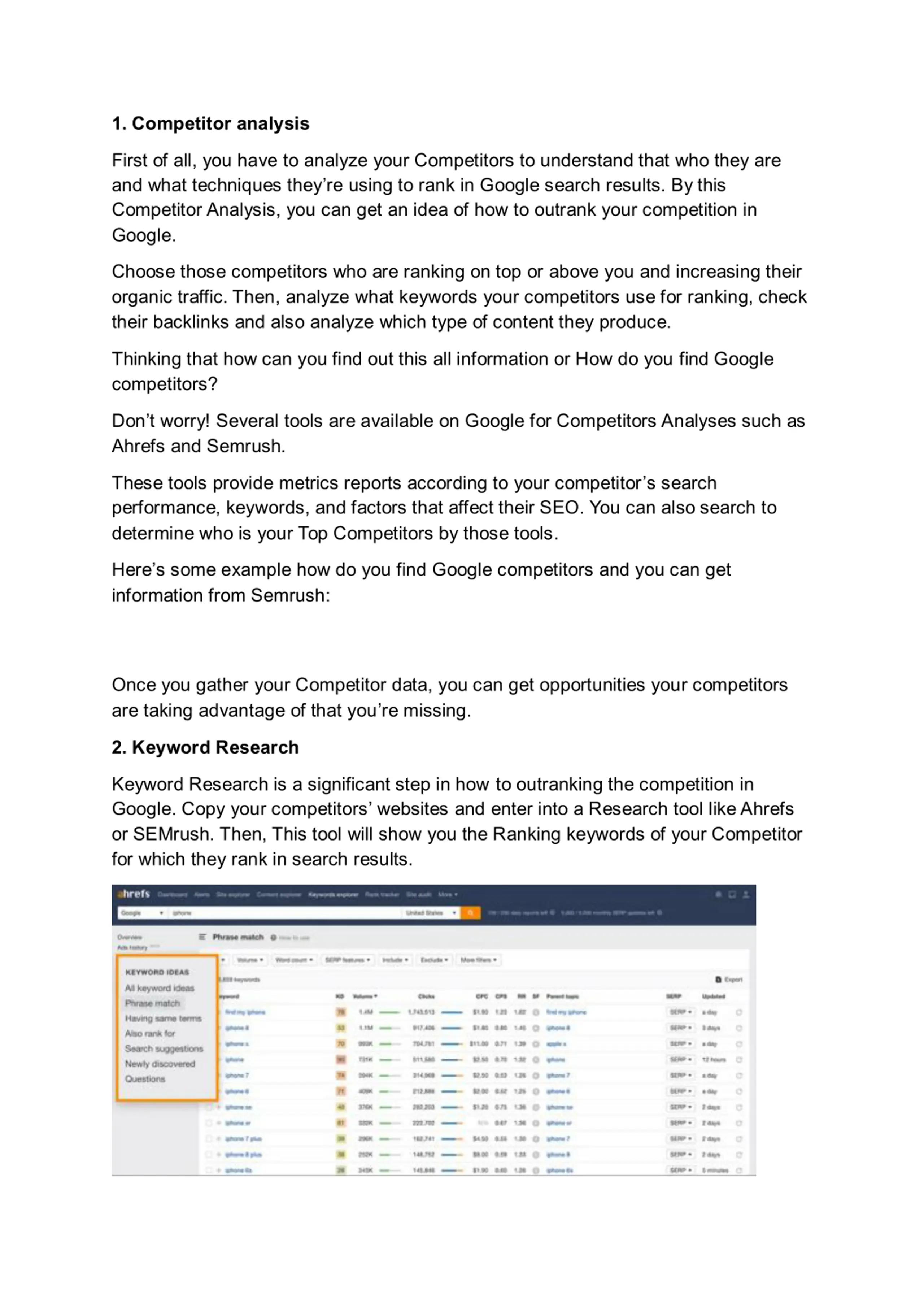 1. Competitor analysis First of all, you have to analyze your Competitors to understand that who they are and what techniques they re using to rank in Google search results. By this Competitor Analysis, you can get an idea of how to outrank your competition in Google. Choose those competitors who are ranking on top or above you and increasing their organic traffic. Then, analyze what keywords your competitors use for ranking, check their backlinks and also analyze which type of content they produce. Thinking that how can you find out this all information or How do you find Google competitors? Don t worry! Several tools are available on Google for Competitors Analyses such as Ahrefs and Semrush. These tools provide metrics reports according to your competitor s search performance, keywords, and factors that affect their SEO. You can also search to determine who is your Top Competitors by those tools. Here s some example how do you find Google competitors and you can get information from Semrush: Once you gather your Competitor data, you can get opportunities your competitors are taking advantage of that you re missing. 2. Keyword Research Keyword Research is a significant step in how to outranking the competition in Google. Copy your competitors websites and enter into a Research tool like Ahrefs or SEMrush. Then, This tool will show you the Ranking keywords of your Competitor for which they rank in search results.