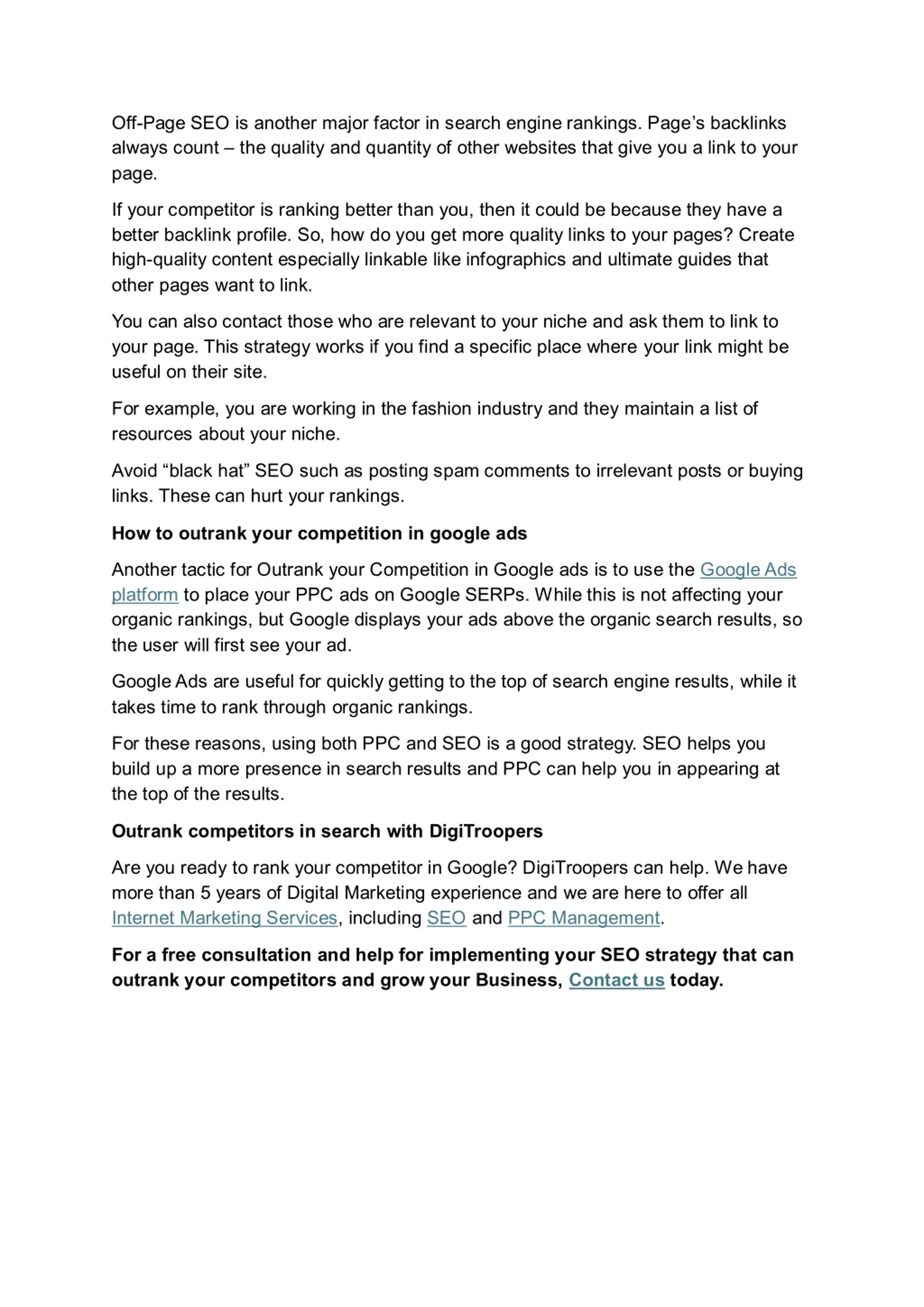 Off-Page SEO is another major factor in search engine rankings. Pages backlinks always count the quality and quantity of other websites that give you a link to your page. If your competitor is ranking better than you, then it could be because they have a better backlink profile. So, how do you get more quality links to your pages? Create high-quality content especially linkable like infographics and ultimate guides that other pages want to link. You can also contact those who are relevant to your niche and ask them to link to your page. This strategy works if you find a specific place where your link might be useful on their site. For example, you are working in the fashion industry and they maintain a list of resources about your niche. Avoid black hat SEO such as posting spam comments to irrelevant posts or buying links. These can hurt your rankings. How to outrank your competition in google ads Another tactic for Outrank your Competition in Google ads is to use the Google Ads platform to place your PPC ads on Google SERPs. While this is not affecting your organic rankings, but Google displays your ads above the organic search results, so the user will first see your ad. Google Ads are useful for quickly getting to the top of search engine results, while it takes time to rank through organic rankings. For these reasons, using both PPC and SEO is a good strategy. SEO helps you build up a more presence in search results and PPC can help you in appearing at the top of the results. Outrank competitors in search with DigiTroopers Are you ready to rank your competitor in Google? DigiTroopers can help. We have more than 5 years of Digital Marketing experience and we are here to offer all Internet Marketing Services, including SEO and PPC Management. For a free consultation and help for implementing your SEO strategy that can outrank your competitors and grow your Business, Contact us today.