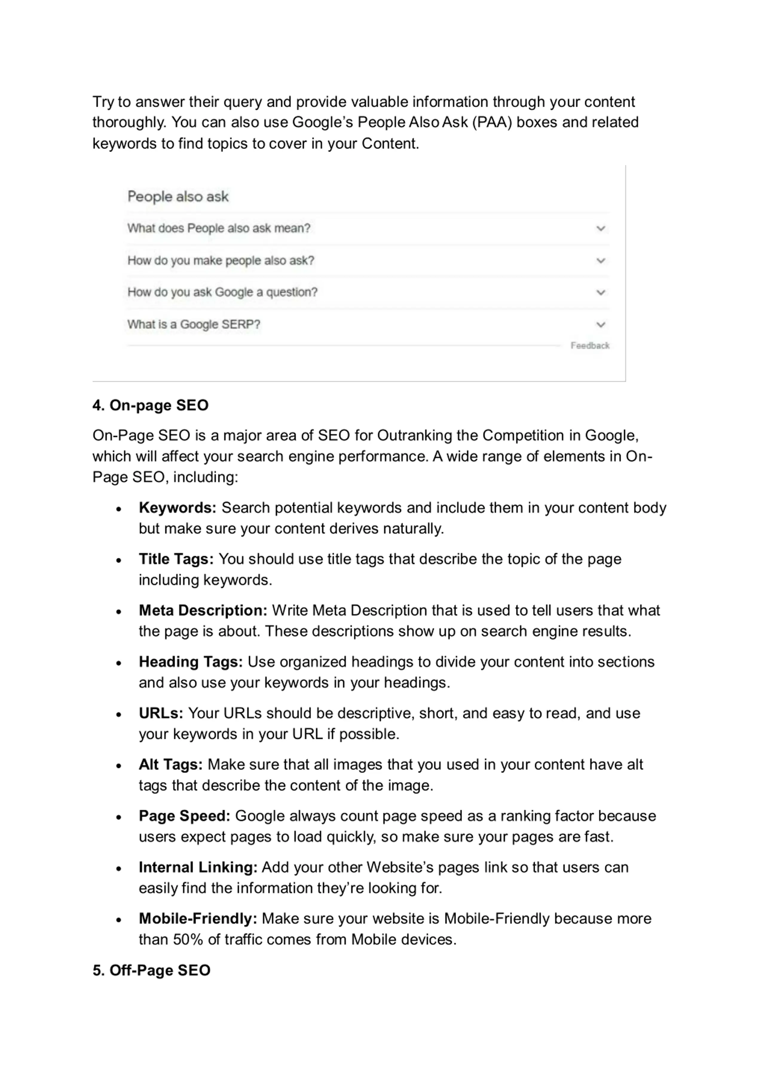 Try to answer their query and provide valuable information through your content thoroughly. You can also use Google s People Also Ask (PAA) boxes and related keywords to find topics to cover in your Content. 4. On-page SEO On-Page SEO is a major area of SEO for Outranking the Competition in Google, which will affect your search engine performance. A wide range of elements in On- Page SEO, including: Keywords: Search potential keywords and include them in your content body but make sure your content derives naturally. Title Tags: You should use title tags that describe the topic of the page including keywords. Meta Description: Write Meta Description that is used to tell users that what the page is about. These descriptions show up on search engine results. Heading Tags: Use organized headings to divide your content into sections and also use your keywords in your headings. URLs: Your URLs should be descriptive, short, and easy to read, and use your keywords in your URL if possible. Alt Tags: Make sure that all images that you used in your content have alt tags that describe the content of the image. Page Speed: Google always count page speed as a ranking factor because users expect pages to load quickly, so make sure your pages are fast. Internal Linking: Add your other Website s pages link so that users can easily find the information they re looking for. Mobile-Friendly: Make sure your website is Mobile-Friendly because more than 50% of traffic comes from Mobile devices. 5. Off-Page SEO