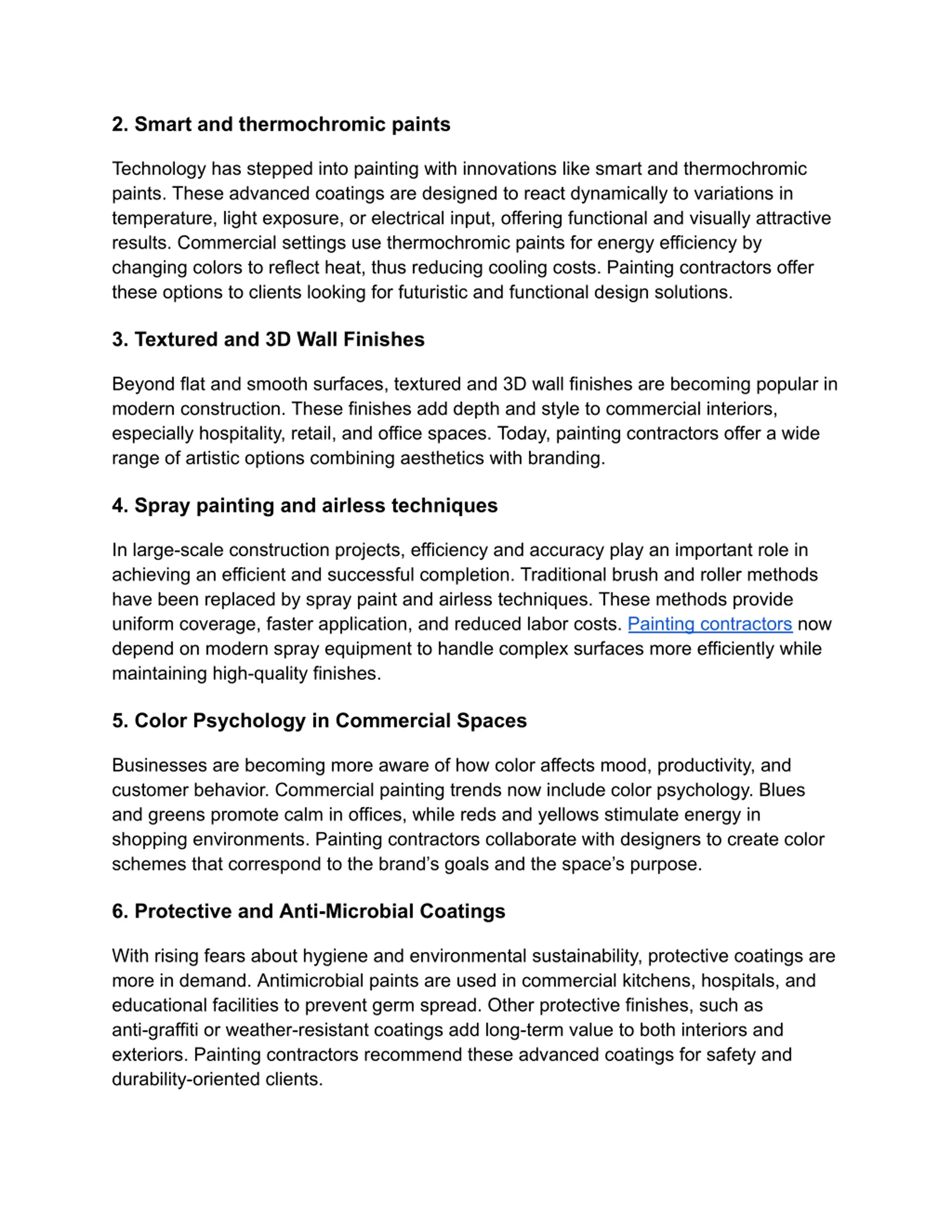 2. Smart and thermochromic paints Technology has stepped into painting with innovations like smart and thermochromic paints. These advanced coatings are designed to react dynamically to variations in temperature, light exposure, or electrical input, offering functional and visually attractive results. Commercial settings use thermochromic paints for energy efficiency by changing colors to reflect heat, thus reducing cooling costs. Painting contractors offer these options to clients looking for futuristic and functional design solutions. 3. Textured and 3D Wall Finishes Beyond flat and smooth surfaces, textured and 3D wall finishes are becoming popular in modern construction. These finishes add depth and style to commercial interiors, especially hospitality, retail, and office spaces. Today, painting contractors offer a wide range of artistic options combining aesthetics with branding. 4. Spray painting and airless techniques In large-scale construction projects, efficiency and accuracy play an important role in achieving an efficient and successful completion. Traditional brush and roller methods have been replaced by spray paint and airless techniques. These methods provide uniform coverage, faster application, and reduced labor costs. Painting contractors now depend on modern spray equipment to handle complex surfaces more efficiently while maintaining high-quality finishes. 5. Color Psychology in Commercial Spaces Businesses are becoming more aware of how color affects mood, productivity, and customer behavior. Commercial painting trends now include color psychology. Blues and greens promote calm in offices, while reds and yellows stimulate energy in shopping environments. Painting contractors collaborate with designers to create color schemes that correspond to the brand s goals and the space s purpose. 6. Protective and Anti-Microbial Coatings With rising fears about hygiene and environmental sustainability, protective coatings are more in demand. Antimicrobial paints are used in commercial kitchens, hospitals, and educational facilities to prevent germ spread. Other protective finishes, such as anti-graffiti or weather-resistant coatings add long-term value to both interiors and exteriors. Painting contractors recommend these advanced coatings for safety and durability-oriented clients.