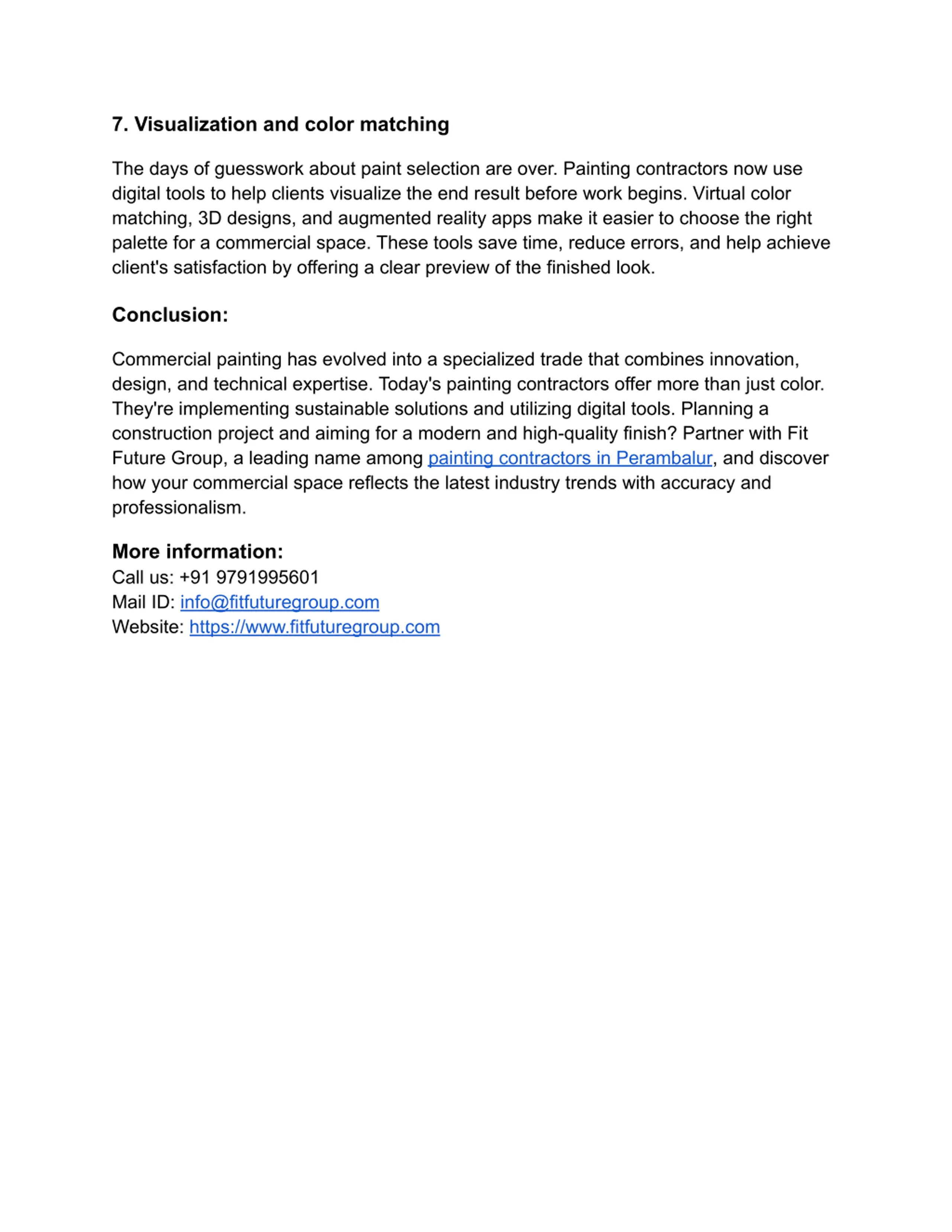 7. Visualization and color matching The days of guesswork about paint selection are over. Painting contractors now use digital tools to help clients visualize the end result before work begins. Virtual color matching, 3D designs, and augmented reality apps make it easier to choose the right palette for a commercial space. These tools save time, reduce errors, and help achieve client's satisfaction by offering a clear preview of the finished look. Conclusion: Commercial painting has evolved into a specialized trade that combines innovation, design, and technical expertise. Today's painting contractors offer more than just color. They're implementing sustainable solutions and utilizing digital tools. Planning a construction project and aiming for a modern and high-quality finish? Partner with Fit Future Group, a leading name among painting contractors in Perambalur, and discover how your commercial space reflects the latest industry trends with accuracy and professionalism. More information: Call us: +91 9791995601 Mail ID: info@fitfuturegroup.com Website: https://www.fitfuturegroup.com