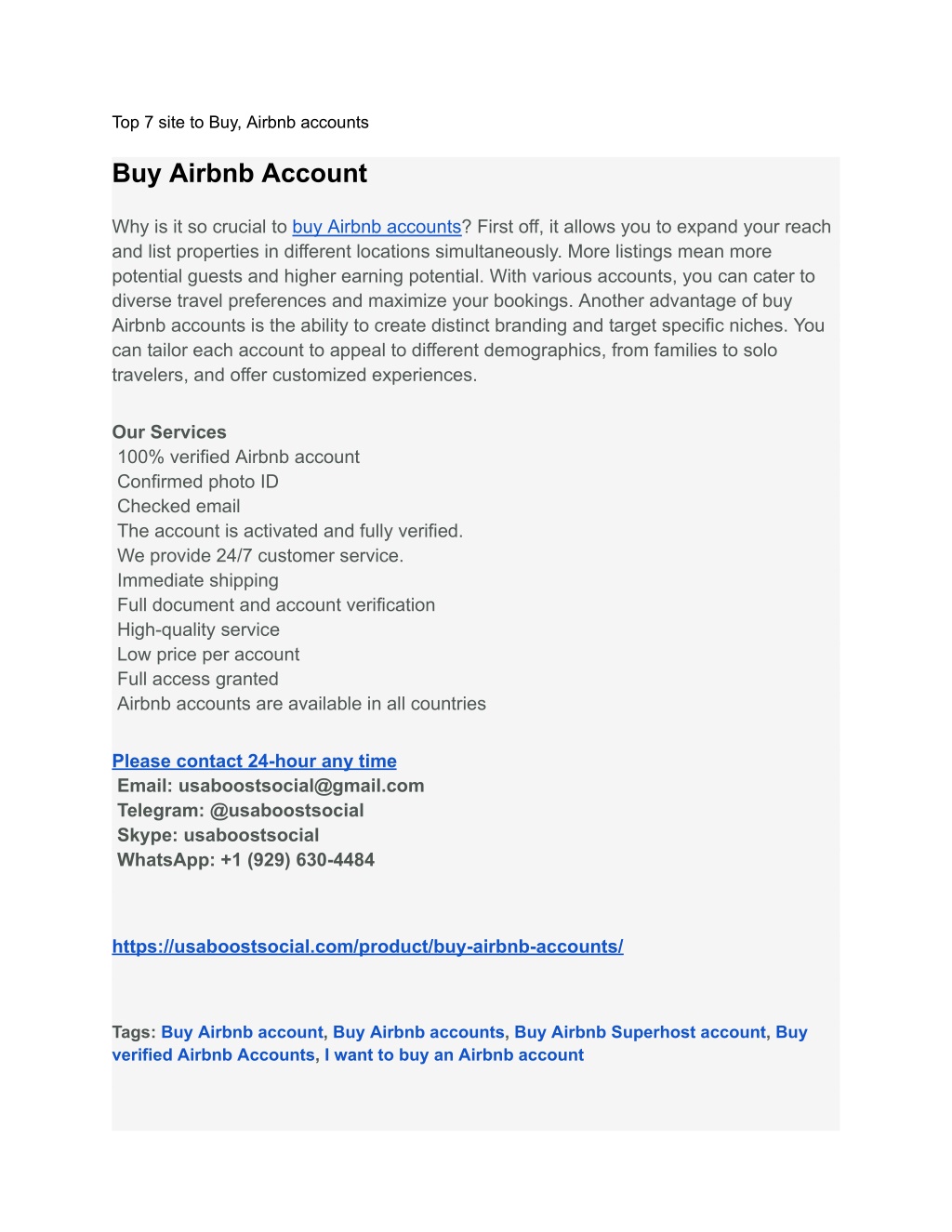 1. Top 7 site to Buy, Airbnb accounts Buy Airbnb Account Why is it so crucial to buy Airbnb accounts? First off, it allows you to expand your reach and list properties in different locations simultaneously. More listings mean more potential guests and higher earning potential. With various accounts, you can cater to diverse travel preferences and maximize your bookings. Another advantage of buy Airbnb accounts is the ability to create distinct branding and target specific niches. You can tailor each account to appeal to different demographics, from families to solo travelers, and offer customized experiences. Our Services 100% verified Airbnb account Confirmed photo ID Checked email The account is activated and fully verified. We provide 24/7 customer service. Immediate shipping Full document and account verification High-quality service Low price per account Full access granted Airbnb accounts are available in all countries Please contact 24-hour any time Email: usaboostsocial@gmail.com Telegram: @usaboostsocial Skype: usaboostsocial WhatsApp: +1 (929) 630-4484 https://usaboostsocial.com/product/buy-airbnb-accounts/ Tags: Buy Airbnb account, Buy Airbnb accounts, Buy Airbnb Superhost account, Buy verified Airbnb Accounts, I want to buy an Airbnb account
