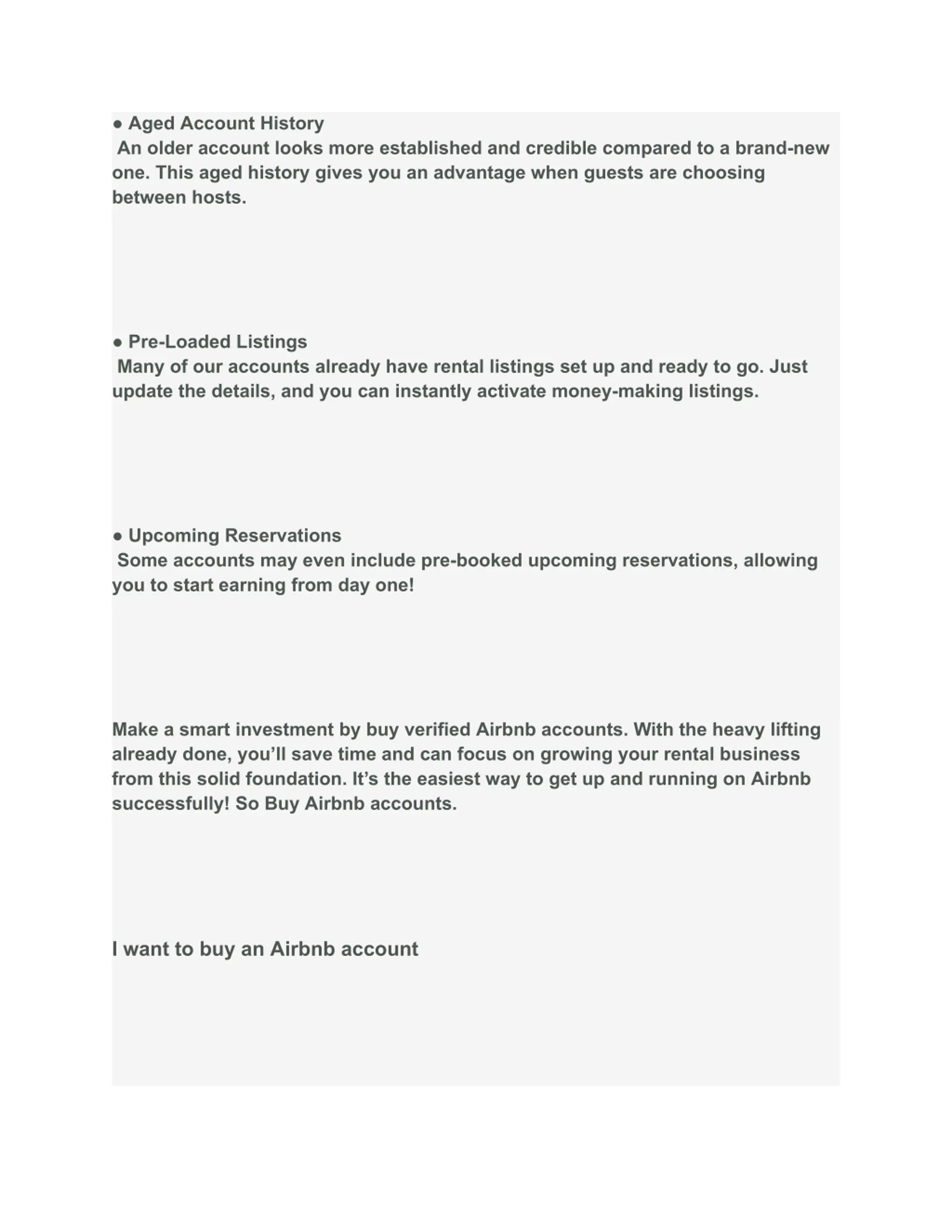 8. Aged Account History An older account looks more established and credible compared to a brand-new one. This aged history gives you an advantage when guests are choosing between hosts. Pre-Loaded Listings Many of our accounts already have rental listings set up and ready to go. Just update the details, and you can instantly activate money-making listings. Upcoming Reservations Some accounts may even include pre-booked upcoming reservations, allowing you to start earning from day one! Make a smart investment by buy verified Airbnb accounts. With the heavy lifting already done, you ll save time and can focus on growing your rental business from this solid foundation. It s the easiest way to get up and running on Airbnb successfully! So Buy Airbnb accounts. I want to buy an Airbnb account