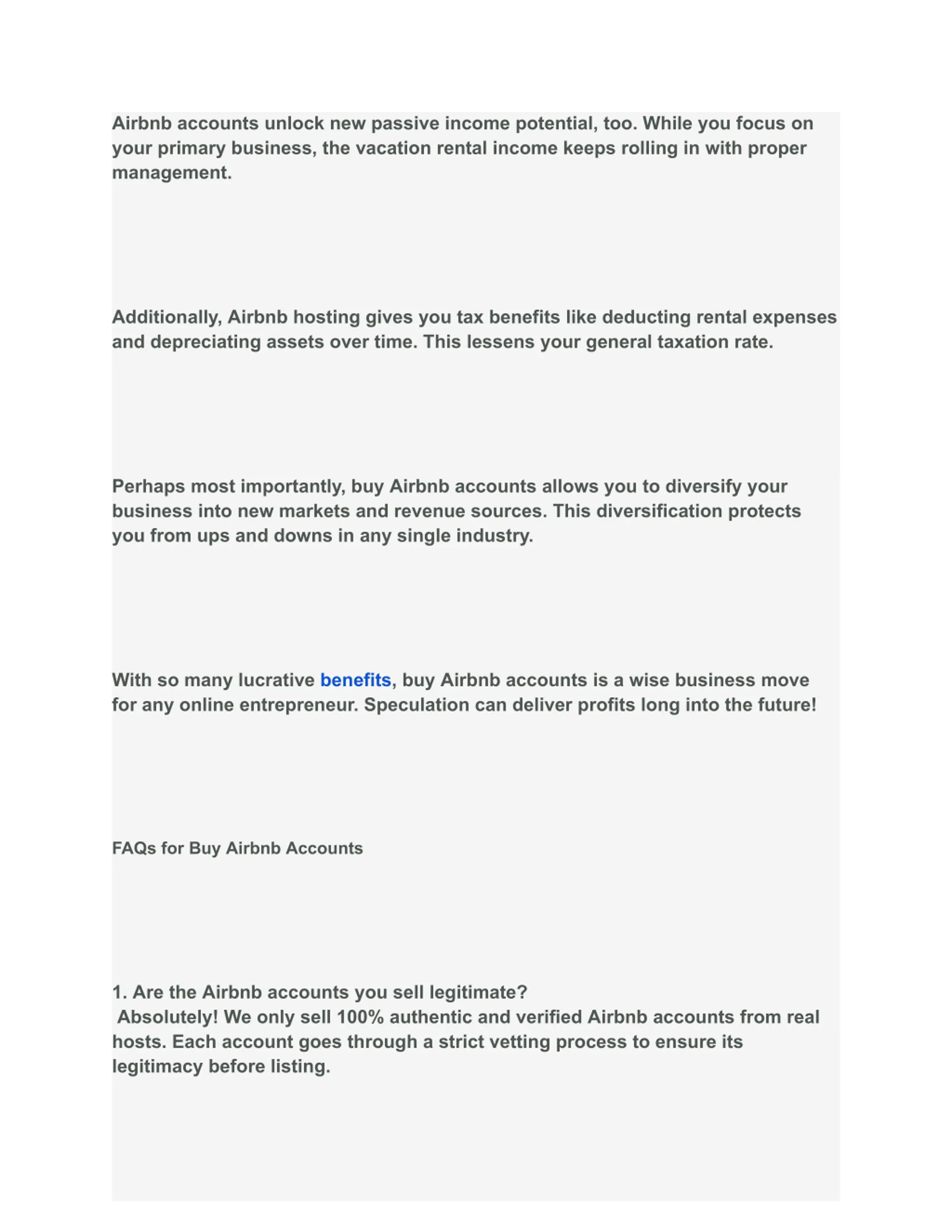 13. Airbnb accounts unlock new passive income potential, too. While you focus on your primary business, the vacation rental income keeps rolling in with proper management. Additionally, Airbnb hosting gives you tax benefits like deducting rental expenses and depreciating assets over time. This lessens your general taxation rate. Perhaps most importantly, buy Airbnb accounts allows you to diversify your business into new markets and revenue sources. This diversification protects you from ups and downs in any single industry. With so many lucrative benefits, buy Airbnb accounts is a wise business move for any online entrepreneur. Speculation can deliver profits long into the future! FAQs for Buy Airbnb Accounts 1. Are the Airbnb accounts you sell legitimate? Absolutely! We only sell 100% authentic and verified Airbnb accounts from real hosts. Each account goes through a strict vetting process to ensure its legitimacy before listing.