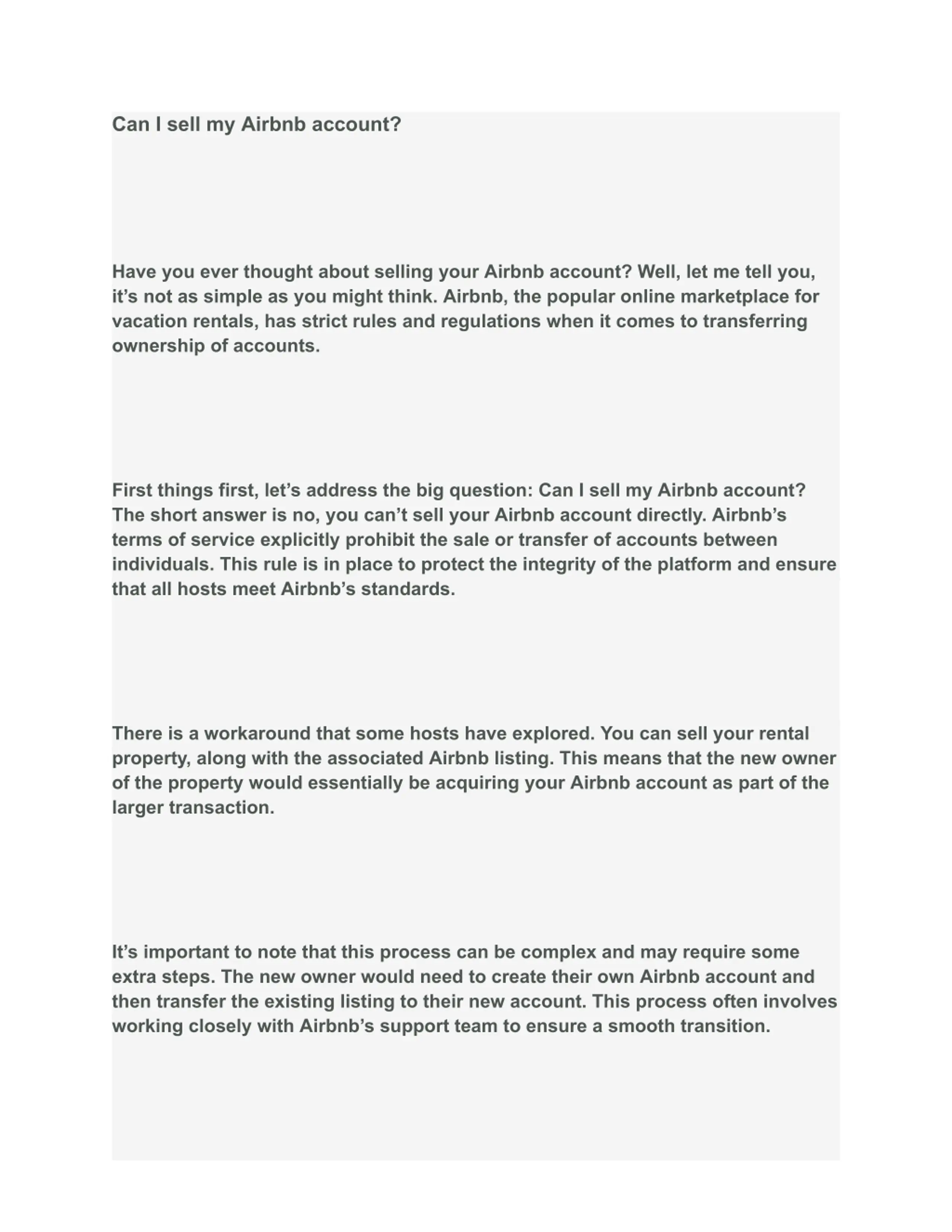 16. Now, lets talk about why someone might want to sell their Airbnb account in the first place. Perhaps you re moving to a new location and can t manage your rental property anymore. Or maybe you re looking to retire from the vacation rental business altogether. Whatever the reason, selling your Airbnb account (or rather, your rental property with the associated listing) can be a way to cash in on your hard work and success as a host. Before you decide to sell, it s crucial to understand the potential risks and challenges involved. For example, you ll need to ensure that all outstanding bookings and reservations are properly handled during the transition period. Additionally, you ll want to carefully vet potential buyers to ensure they meet Airbnb s hosting requirements and can maintain the high standards you ve set for your listing. If you re considering selling your Airbnb account, it s always a good idea to consult with Airbnb s support team or seek professional guidance from a real estate attorney or broker. They can help you navigate the process and ensure that you re following all necessary rules and regulations. While you can t directly sell your Airbnb account, there are ways to transfer ownership of your rental property and its associated listing to a new owner. Just remember to do your research, follow the proper procedures, and prioritize the safety and satisfaction of your guests throughout the process. Conclusion