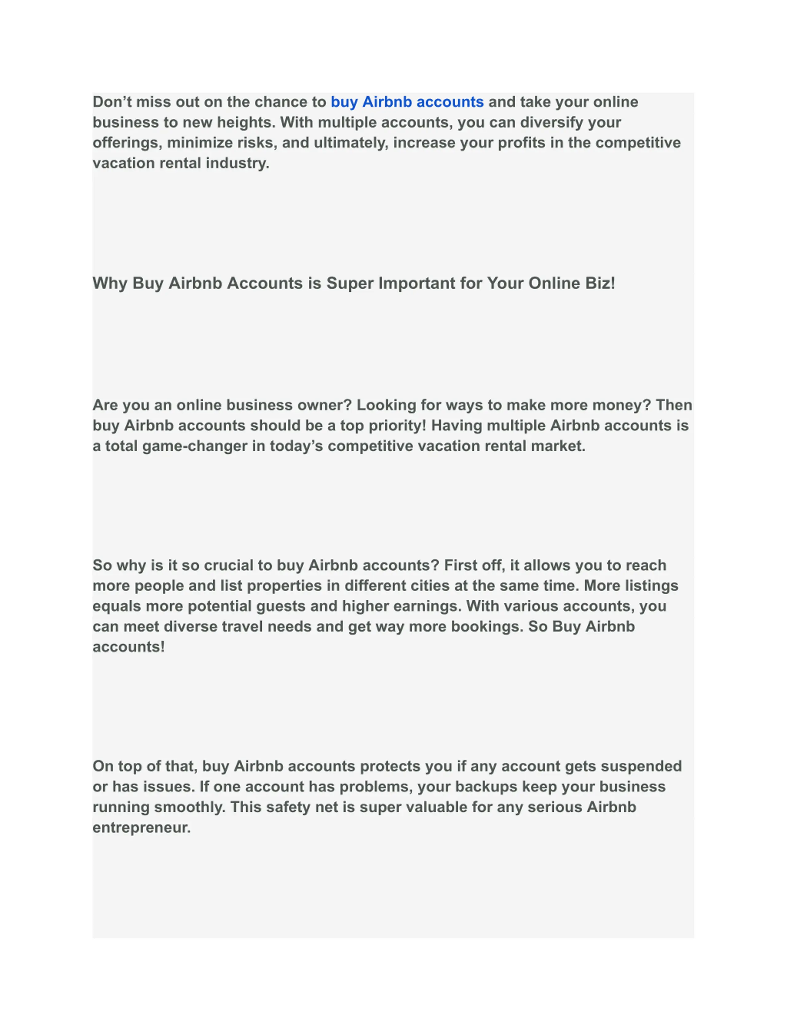 3. Dont miss out on the chance to buy Airbnb accounts and take your online business to new heights. With multiple accounts, you can diversify your offerings, minimize risks, and ultimately, increase your profits in the competitive vacation rental industry. Why Buy Airbnb Accounts is Super Important for Your Online Biz! Are you an online business owner? Looking for ways to make more money? Then buy Airbnb accounts should be a top priority! Having multiple Airbnb accounts is a total game-changer in today s competitive vacation rental market. So why is it so crucial to buy Airbnb accounts? First off, it allows you to reach more people and list properties in different cities at the same time. More listings equals more potential guests and higher earnings. With various accounts, you can meet diverse travel needs and get way more bookings. So Buy Airbnb accounts! On top of that, buy Airbnb accounts protects you if any account gets suspended or has issues. If one account has problems, your backups keep your business running smoothly. This safety net is super valuable for any serious Airbnb entrepreneur.