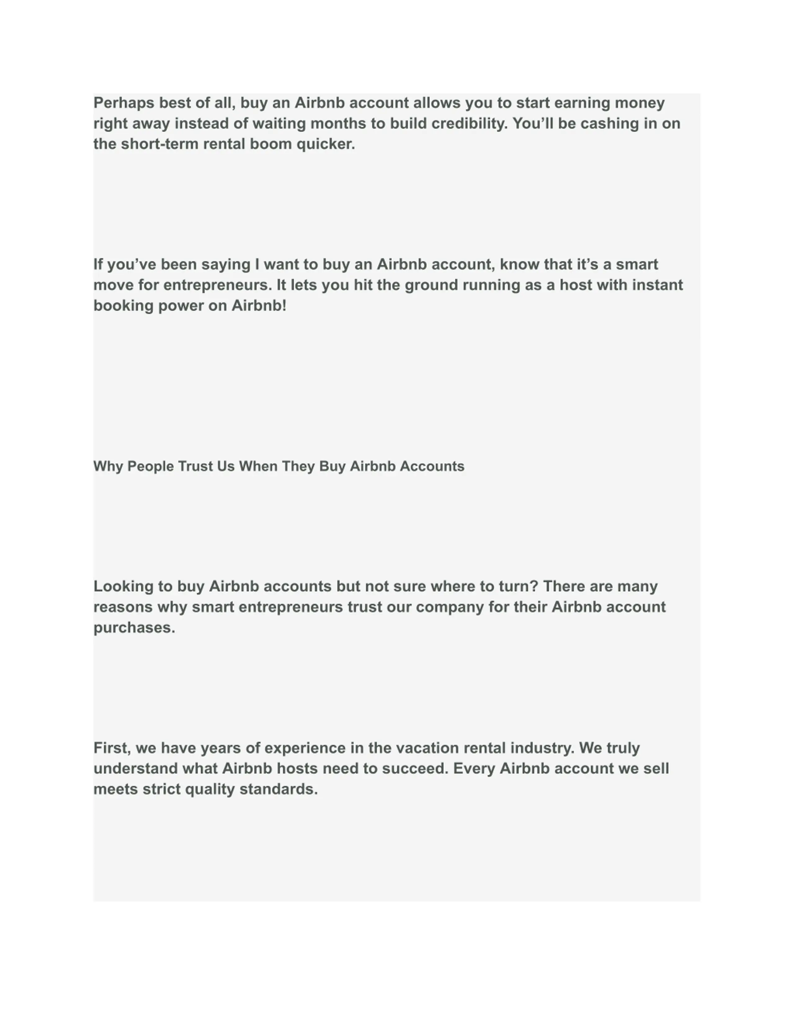 10. Perhaps best of all, buy an Airbnb account allows you to start earning money right away instead of waiting months to build credibility. You ll be cashing in on the short-term rental boom quicker. If you ve been saying I want to buy an Airbnb account, know that it s a smart move for entrepreneurs. It lets you hit the ground running as a host with instant booking power on Airbnb! Why People Trust Us When They Buy Airbnb Accounts Looking to buy Airbnb accounts but not sure where to turn? There are many reasons why smart entrepreneurs trust our company for their Airbnb account purchases. First, we have years of experience in the vacation rental industry. We truly understand what Airbnb hosts need to succeed. Every Airbnb account we sell meets strict quality standards.