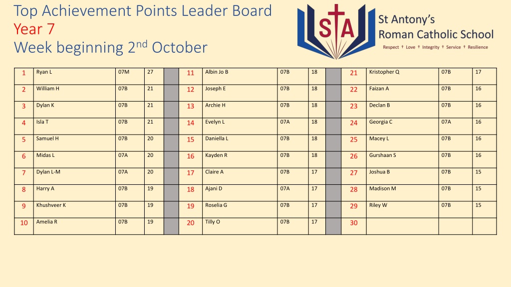 Top Achievement Points Leader Board Year 7 Week beginning 2ndOctober Ryan L 07M 27 Albin Jo B 07B 18 Kristopher Q 07B 17 1 11 21 William H 07B 21 Joseph E 07B 18 Faizan A 07B 16 2 12 22 Dylan K 07B 21 Archie H 07B 18 Declan B 07B 16 3 13 23 Isla T 07B 21 Evelyn L 07A 18 Georgia C 07A 16 4 14 24 Samuel H 07B 20 Daniella L 07B 18 Macey L 07B 16 5 15 25 Midas L 07A 20 Kayden R 07B 18 Gurshaan S 07B 16 6 16 26 Dylan L-M 07A 20 Claire A 07B 17 Joshua B 07B 15 7 17 27 Harry A 07B 19 Ajani D 07A 17 Madison M 07B 15 8 18 28 Khushveer K 07B 19 Roselia G 07B 17 Riley W 07B 15 9 19 29 Amelia R 07B 19 Tilly O 07B 17 10 20 30