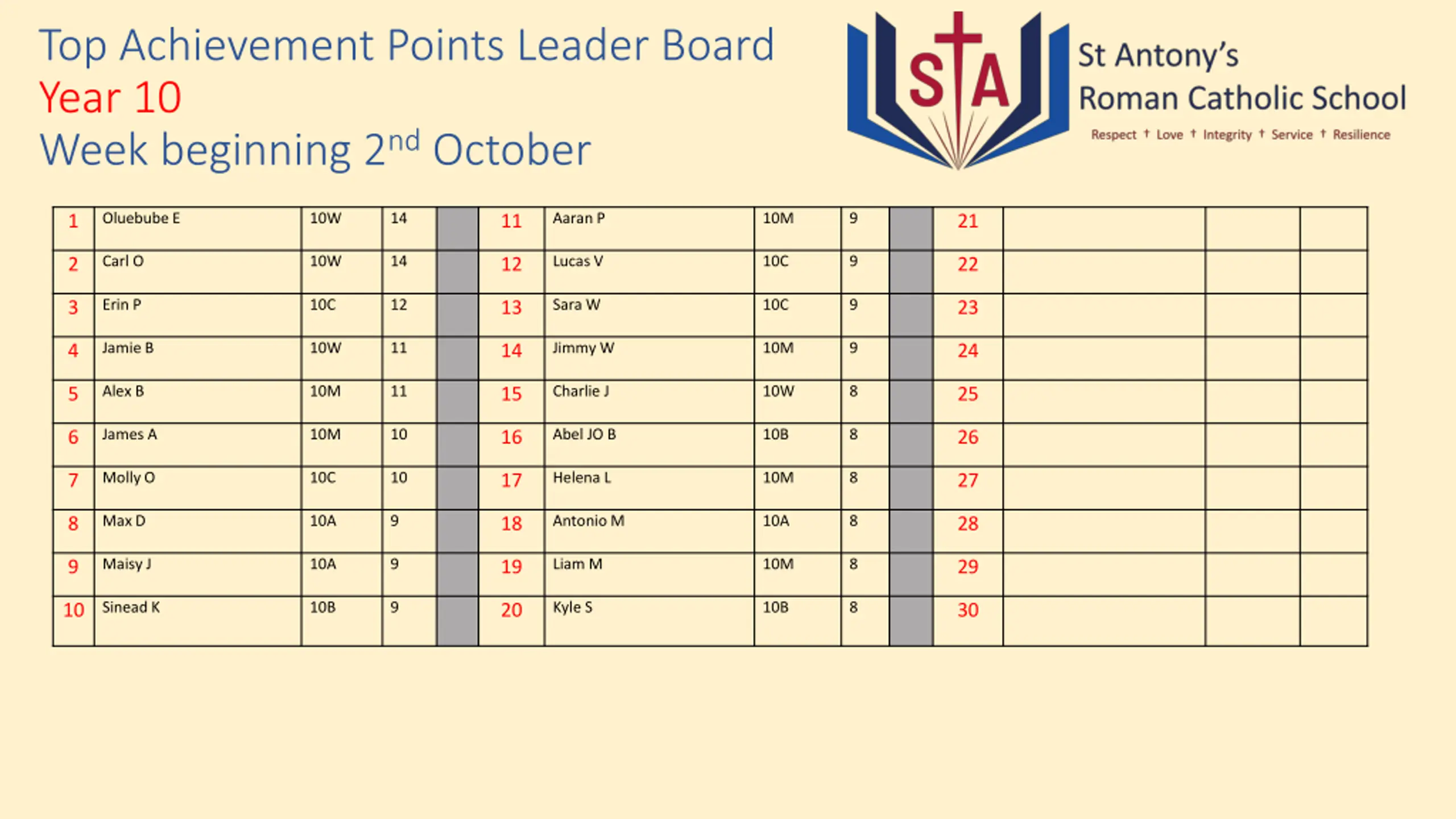 Top Achievement Points Leader Board Year 10 Week beginning 2ndOctober Oluebube E 10W 14 Aaran P 10M 9 1 11 21 Carl O 10W 14 Lucas V 10C 9 2 12 22 Erin P 10C 12 Sara W 10C 9 3 13 23 Jamie B 10W 11 Jimmy W 10M 9 4 14 24 Alex B 10M 11 Charlie J 10W 8 5 15 25 James A 10M 10 Abel JO B 10B 8 6 16 26 Molly O 10C 10 Helena L 10M 8 7 17 27 Max D 10A 9 Antonio M 10A 8 8 18 28 Maisy J 10A 9 Liam M 10M 8 9 19 29 Sinead K 10B 9 Kyle S 10B 8 10 20 30