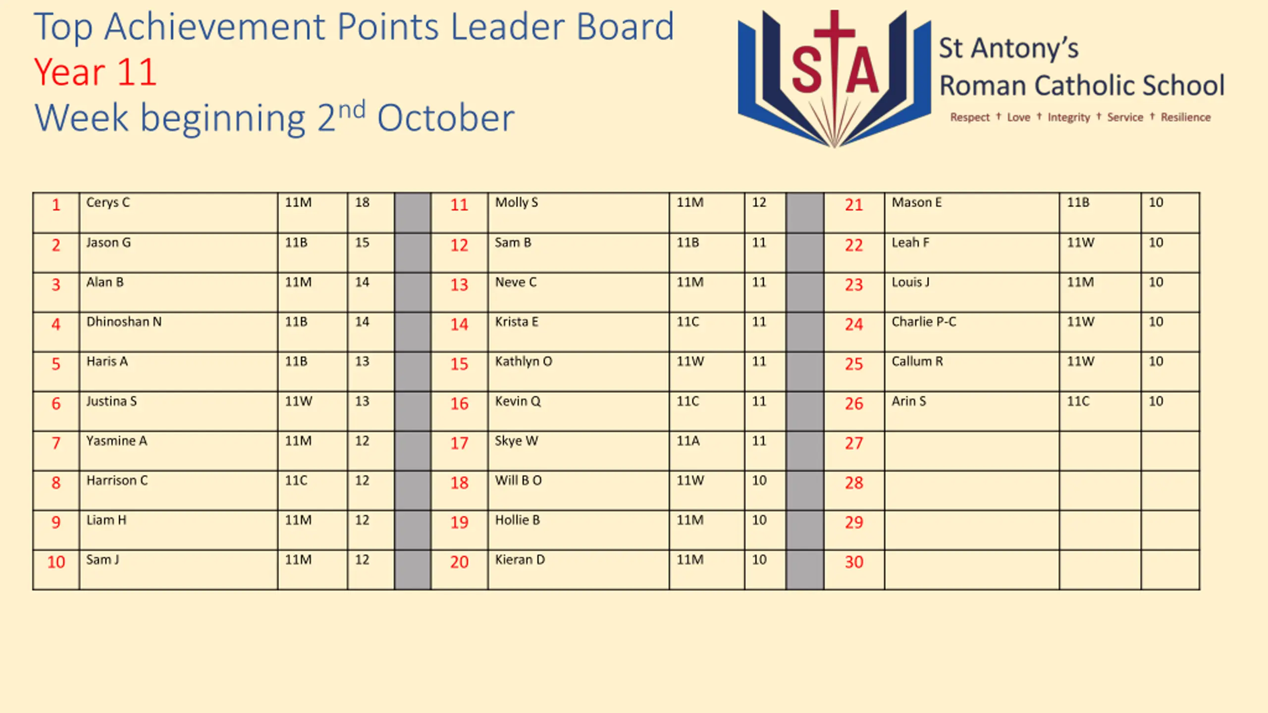 Top Achievement Points Leader Board Year 11 Week beginning 2ndOctober Cerys C 11M 18 Molly S 11M 12 Mason E 11B 10 1 11 21 Jason G 11B 15 Sam B 11B 11 Leah F 11W 10 2 12 22 Alan B 11M 14 Neve C 11M 11 Louis J 11M 10 3 13 23 Dhinoshan N 11B 14 Krista E 11C 11 Charlie P-C 11W 10 4 14 24 Haris A 11B 13 Kathlyn O 11W 11 Callum R 11W 10 5 15 25 Justina S 11W 13 Kevin Q 11C 11 Arin S 11C 10 6 16 26 Yasmine A 11M 12 Skye W 11A 11 7 17 27 Harrison C 11C 12 Will B O 11W 10 8 18 28 Liam H 11M 12 Hollie B 11M 10 9 19 29 Sam J 11M 12 Kieran D 11M 10 10 20 30