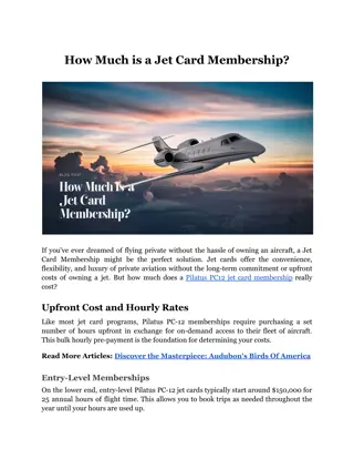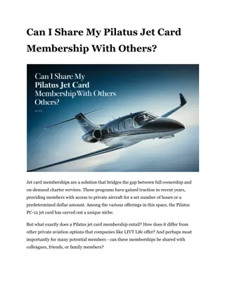 Upfront Cost Moderate High Low Low Operational Flexibility High Moderate High Low Cost per Flight Hour Moderate High Varies Low Access Remote Destinations to Excellent Good Good Limited Customization High High Moderate Low The PC-12 Jet Card offers a balanced approach, combining many of the benefits of ownership with the flexibility of charter services, often at a more attractive price point. How to Choose the Right Jet Card Program? Selecting the right Pilatus jet card membership program requires careful consideration of several factors: Flight hours needed annually Typical flight routes and destinations Flexibility requirements Budget considerations Additional services and perks offered by the program It's important to thoroughly research different providers, comparing their terms, conditions, and pricing structures. Look for transparency in pricing, clear policies on peak day travel and cancellations, and responsive customer service. The Bottom Line The Pilatus PC-12 Jet Card offers a unique combination of flexibility, efficiency, and luxury that caters to a wide range of travel needs. From its cost-effectiveness and impressive performance to its ability to access remote destinations, it represents a smart choice for those looking to elevate their travel experience. The jet card stands out as a forward-thinking solution that balances luxury with practicality, offering a taste of private jet travel without the complexities of ownership.