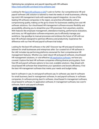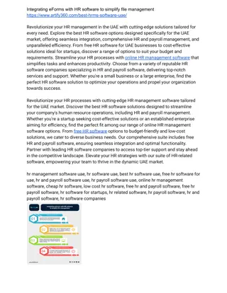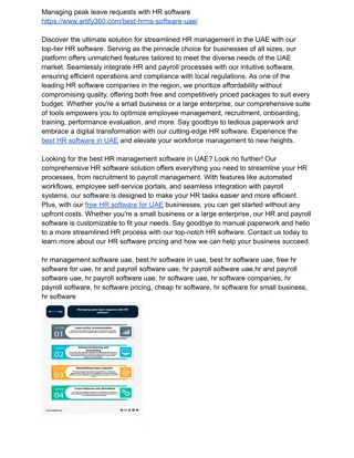 Make informed hiring decisions with attendance data https://www.artify360.com/best-hrms-software-uae/ Elevate your HR management in the UAE with the finest HR software solution available. Explore the best HR software in the UAE that seamlessly integrates HR and payroll functionalities, offering a comprehensive solution for businesses of all sizes. From attendance tracking to payroll processing, our HR software is tailored to meet the specific needs of companies in the UAE market. Whether you're a startup or an established enterprise, our top-rated HR software provides a user-friendly experience, boosting efficiency and productivity. Experience the benefits of free HR software for UAE businesses and streamline your HR processes effortlessly. Discover why we are among the top HR software companies, offering a complete suite of HR-related software solutions. Choose our HR software to simplify your workflows and enhance your HR operations with ease. Enhance your HR operations in the UAE with the best HR software available. Our comprehensive HR software solution caters to all your needs, including payroll management, attendance tracking, and more. Trusted by startups and established companies alike, our top-tier HR software offers seamless integration of HR and payroll functions, making your processes efficient and error-free. Say goodbye to manual tasks with our innovative HR software designed specifically for the UAE market. Discover why we are a top choice among HR software companies in the region. Streamline your HR workflows today with our cutting-edge HR software. best hr software in uae, hr software uae, best hr software uae, hr and payroll software uae, hr payroll software uae, free hr software for uae, hr attendance software, hr software, hr software for startups, hr and payroll software, hr software companies, hr related software, top hr software, hr software list