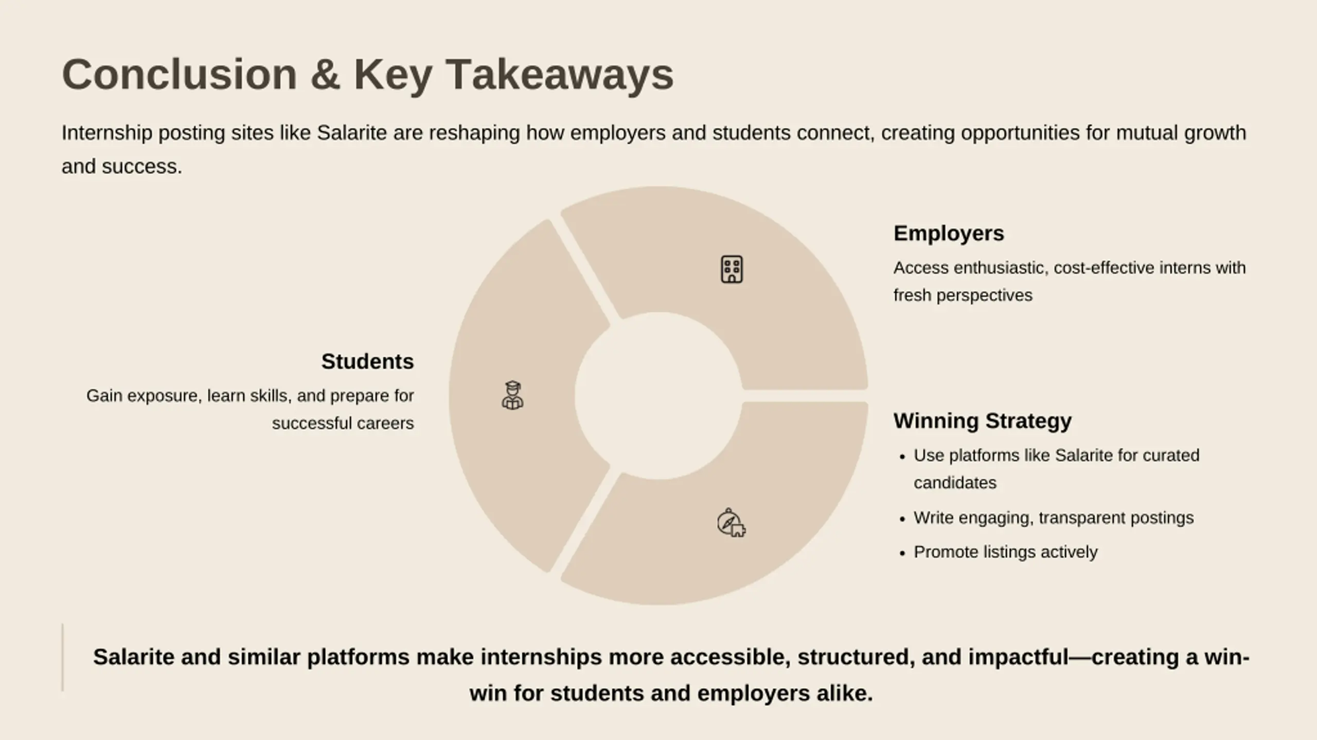 Conclusion & Key Takeaways Internship posting sites like Salarite are reshaping how employers and students connect, creating opportunities for mutual growth and success. Employers Access enthusiastic, cost-effective interns with fresh perspectives Students Gain exposure, learn skills, and prepare for Winning Strategy successful careers Use platforms like Salarite for curated candidates Write engaging, transparent postings Promote listings actively Salarite and similar platforms make internships more accessible, structured, and impactful creating a win- win for students and employers alike.