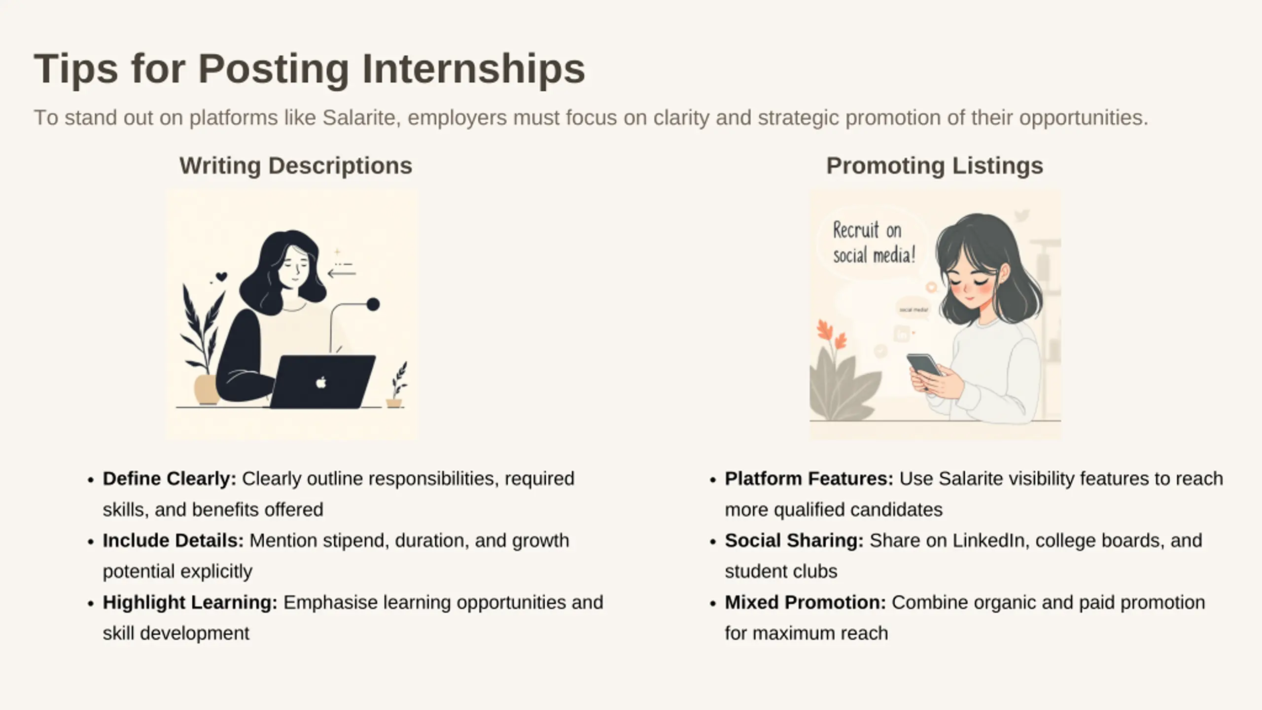 Tips for Posting Internships To stand out on platforms like Salarite, employers must focus on clarity and strategic promotion of their opportunities. Writing Descriptions Promoting Listings Define Clearly: Clearly outline responsibilities, required skills, and benefits offered Include Details: Mention stipend, duration, and growth potential explicitly Highlight Learning: Emphasise learning opportunities and skill development Platform Features: Use Salarite visibility features to reach more qualified candidates Social Sharing: Share on LinkedIn, college boards, and student clubs Mixed Promotion: Combine organic and paid promotion for maximum reach