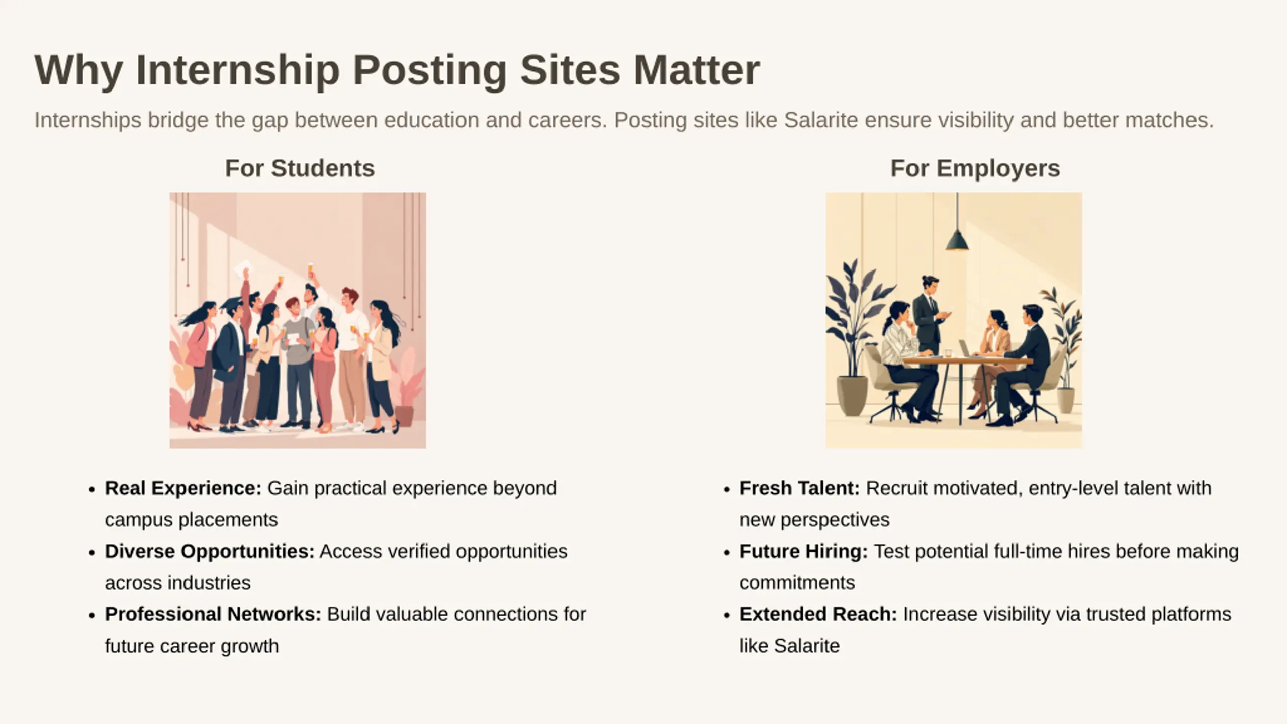 Why Internship Posting Sites Matter Internships bridge the gap between education and careers. Posting sites like Salarite ensure visibility and better matches. For Students For Employers Fresh Talent: Recruit motivated, entry-level talent with new perspectives Future Hiring: Test potential full-time hires before making commitments Extended Reach: Increase visibility via trusted platforms like Salarite Real Experience: Gain practical experience beyond campus placements Diverse Opportunities: Access verified opportunities across industries Professional Networks: Build valuable connections for future career growth