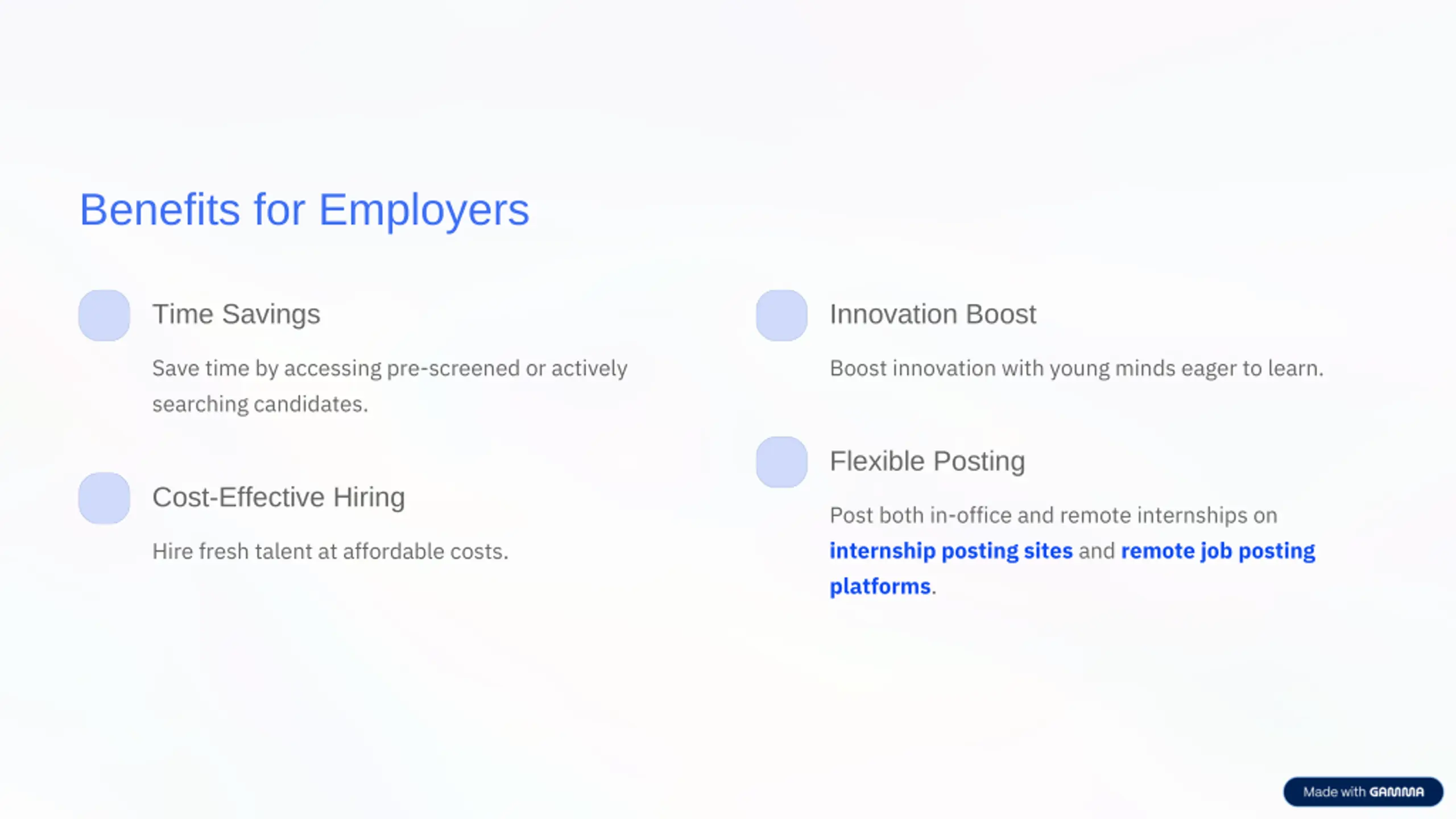 Benefits for Employers Time Savings Innovation Boost Save time by accessing pre-screened or actively searching candidates. Boost innovation with young minds eager to learn. Flexible Posting Cost-Effective Hiring Post both in-office and remote internships on internship posting sites and remote job posting platforms. Hire fresh talent at affordable costs.
