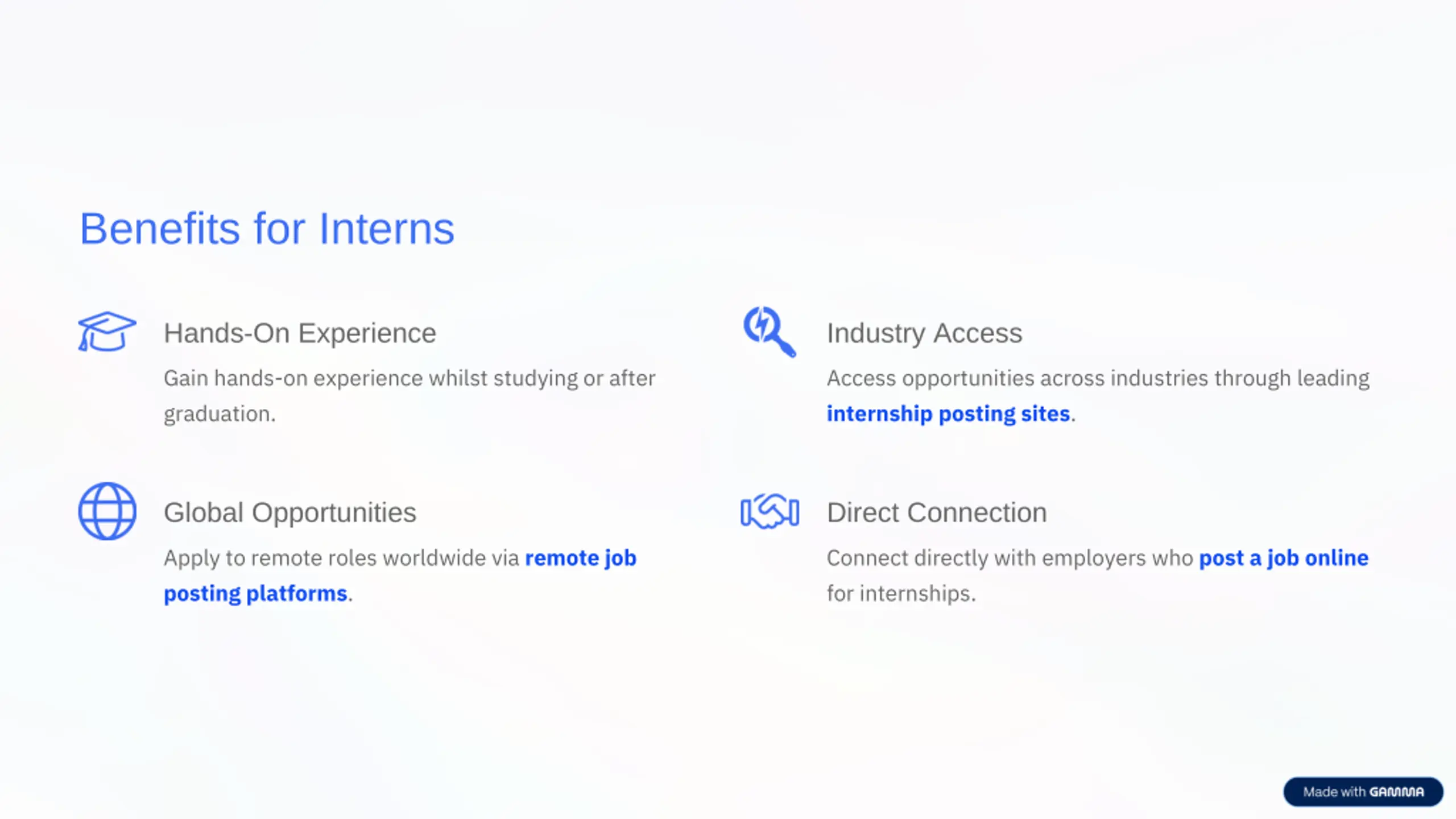 Benefits for Interns Hands-On Experience Industry Access Gain hands-on experience whilst studying or after graduation. Access opportunities across industries through leading internship posting sites. Global Opportunities Direct Connection Apply to remote roles worldwide via remote job posting platforms. Connect directly with employers who post a job online for internships.