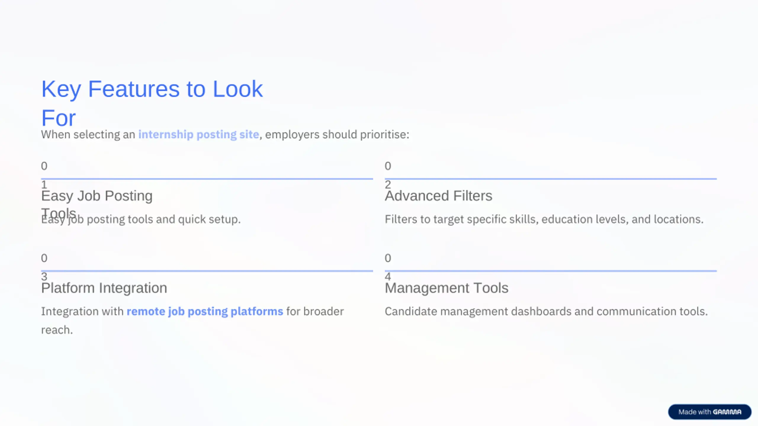 Key Features to Look For When selecting an internship posting site, employers should prioritise: 0 1 Easy Job Posting Tools Easy job posting tools and quick setup. 0 2 Advanced Filters Filters to target specific skills, education levels, and locations. 0 3 Platform Integration 0 4 Management Tools Integration with remote job posting platforms for broader reach. Candidate management dashboards and communication tools.