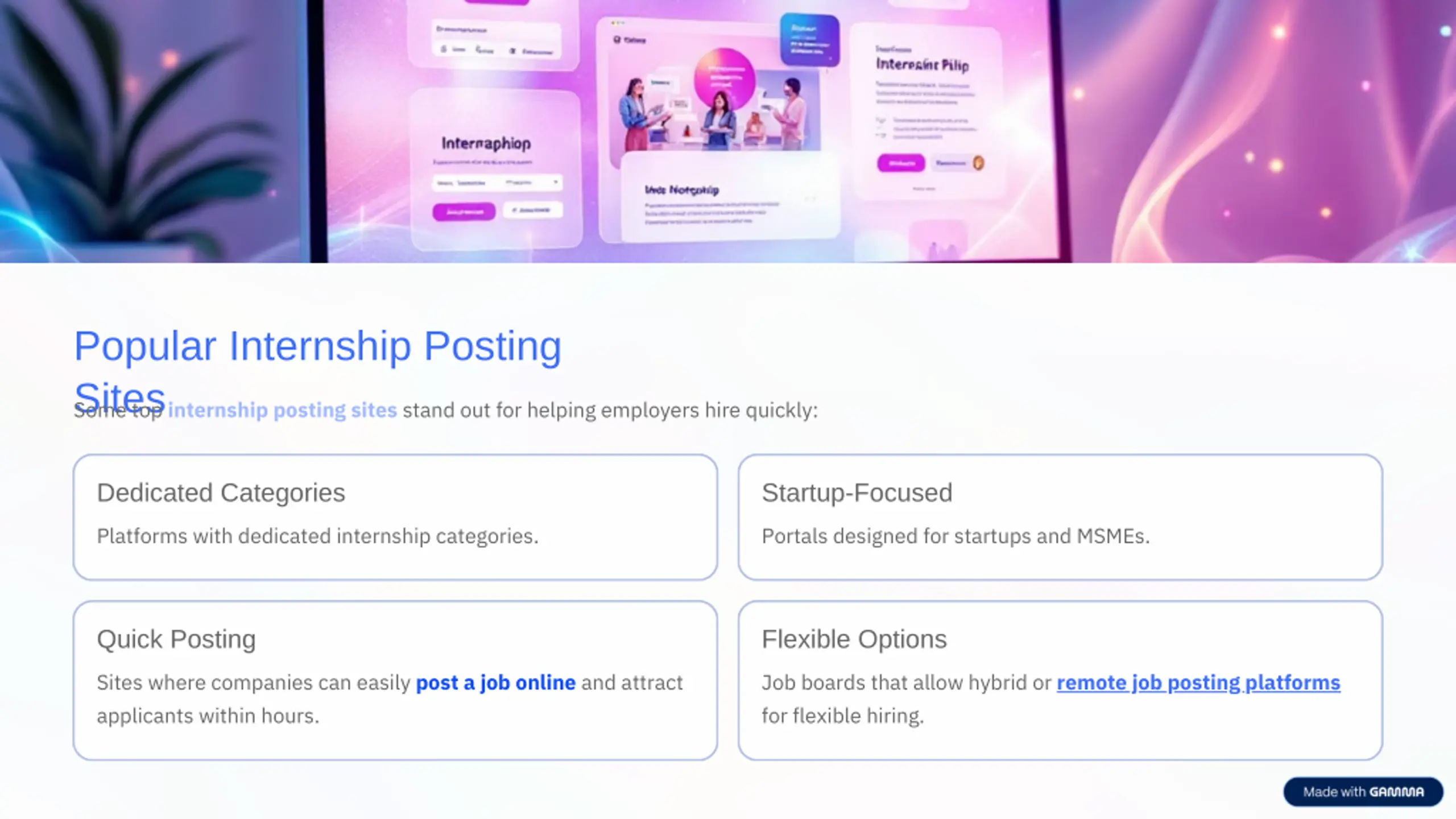 Popular Internship Posting Sites Some top internship posting sites stand out for helping employers hire quickly: Dedicated Categories Startup-Focused Platforms with dedicated internship categories. Portals designed for startups and MSMEs. Quick Posting Flexible Options Sites where companies can easily post a job online and attract applicants within hours. Job boards that allow hybrid or remote job posting platforms for flexible hiring.