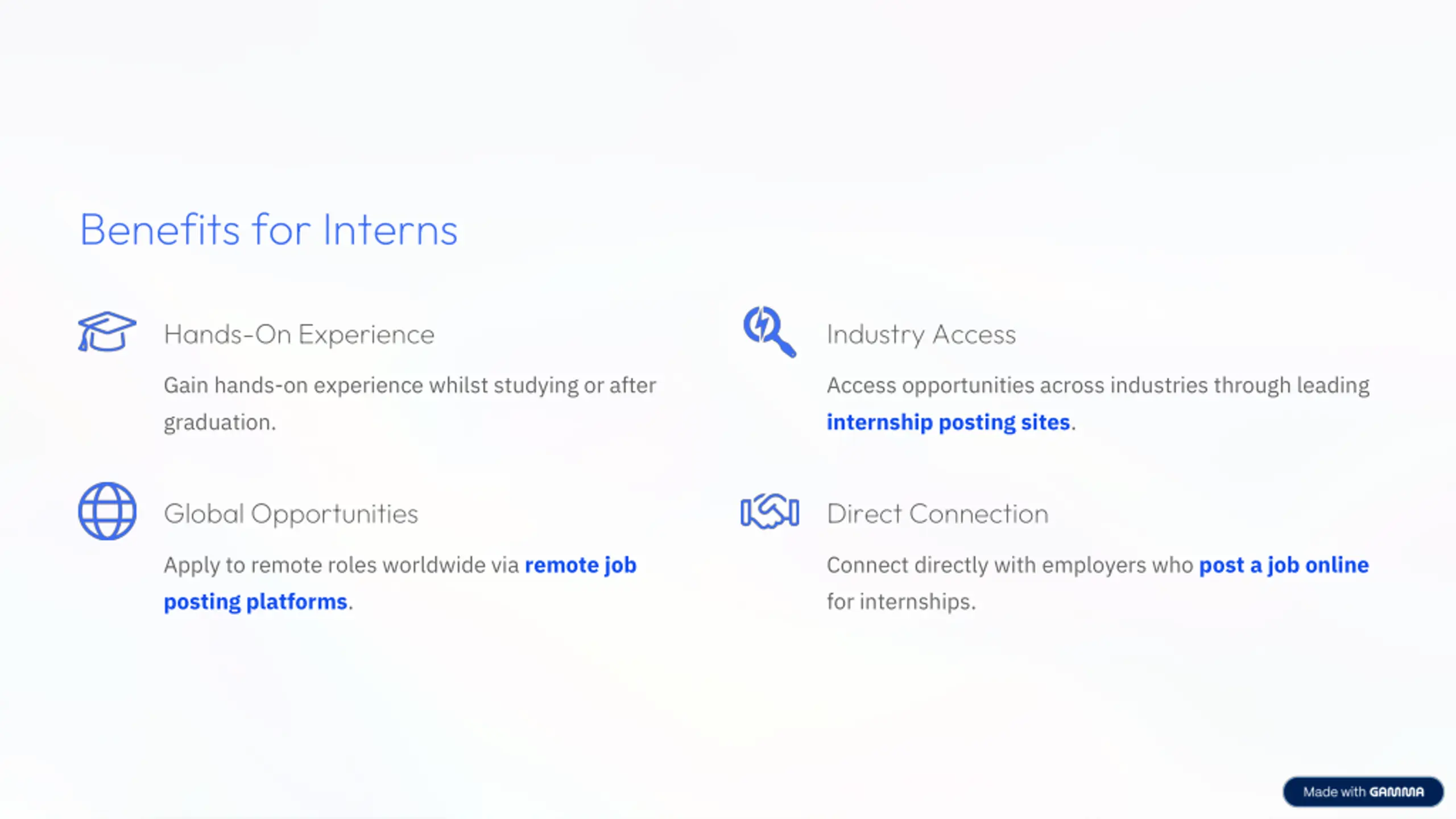 Benefits for Interns Hands-On Experience Industry Access Gain hands-on experience whilst studying or after graduation. Access opportunities across industries through leading internship posting sites. Global Opportunities Direct Connection Apply to remote roles worldwide via remote job posting platforms. Connect directly with employers who post a job online for internships. preencoded.png