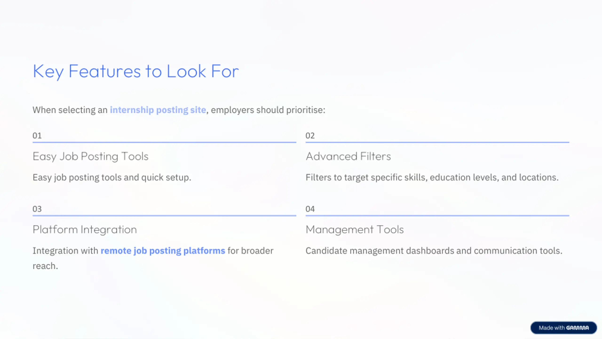 Key Features to Look For When selecting an internship posting site, employers should prioritise: 01 02 Easy Job Posting Tools Advanced Filters Easy job posting tools and quick setup. Filters to target specific skills, education levels, and locations. 03 04 Platform Integration Management Tools Integration with remote job posting platforms for broader reach. Candidate management dashboards and communication tools. preencoded.png