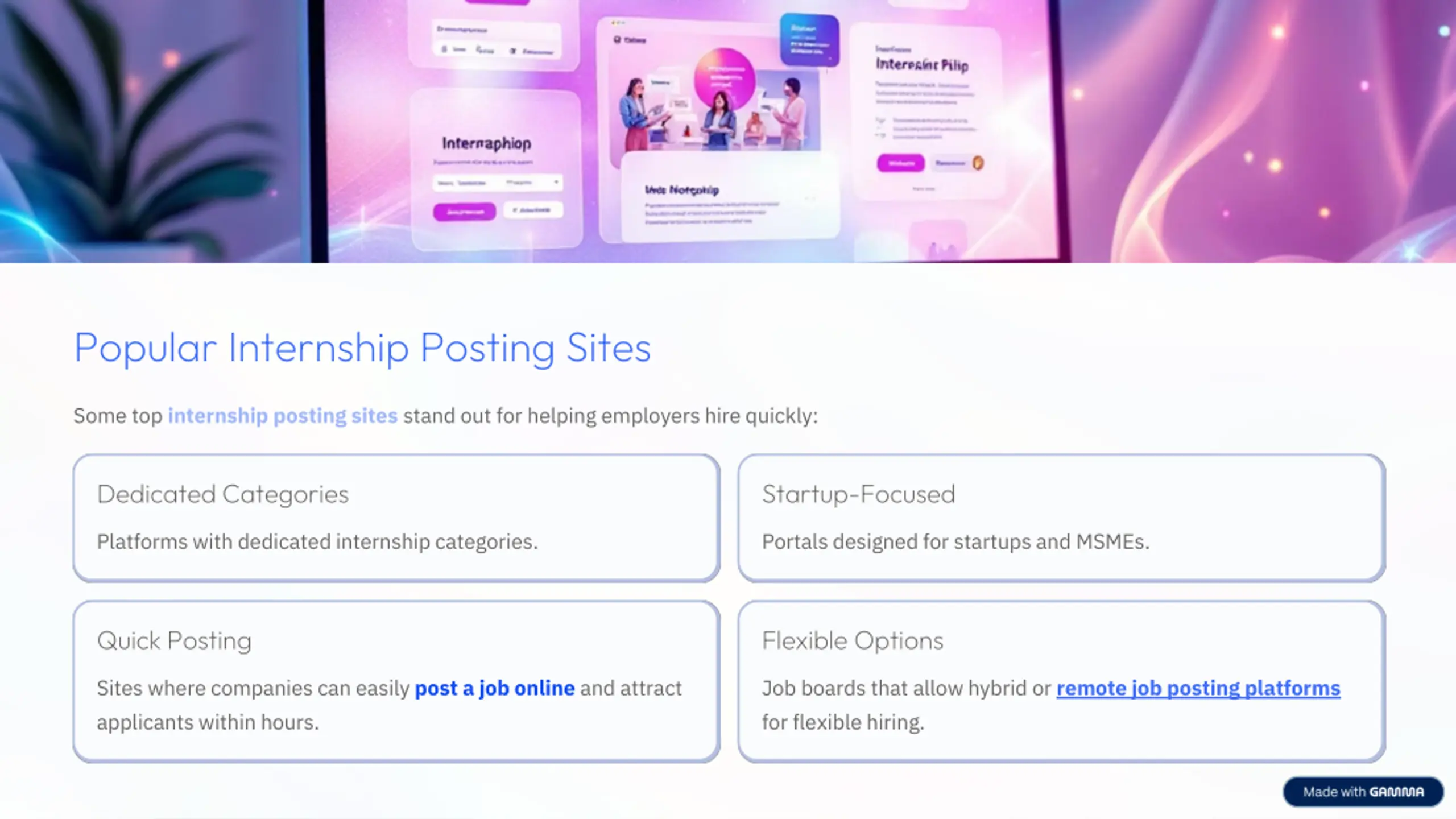 Popular Internship Posting Sites Some top internship posting sites stand out for helping employers hire quickly: Dedicated Categories Startup-Focused Platforms with dedicated internship categories. Portals designed for startups and MSMEs. Quick Posting Flexible Options Sites where companies can easily post a job online and attract applicants within hours. Job boards that allow hybrid or remote job posting platforms for flexible hiring. preencoded.png