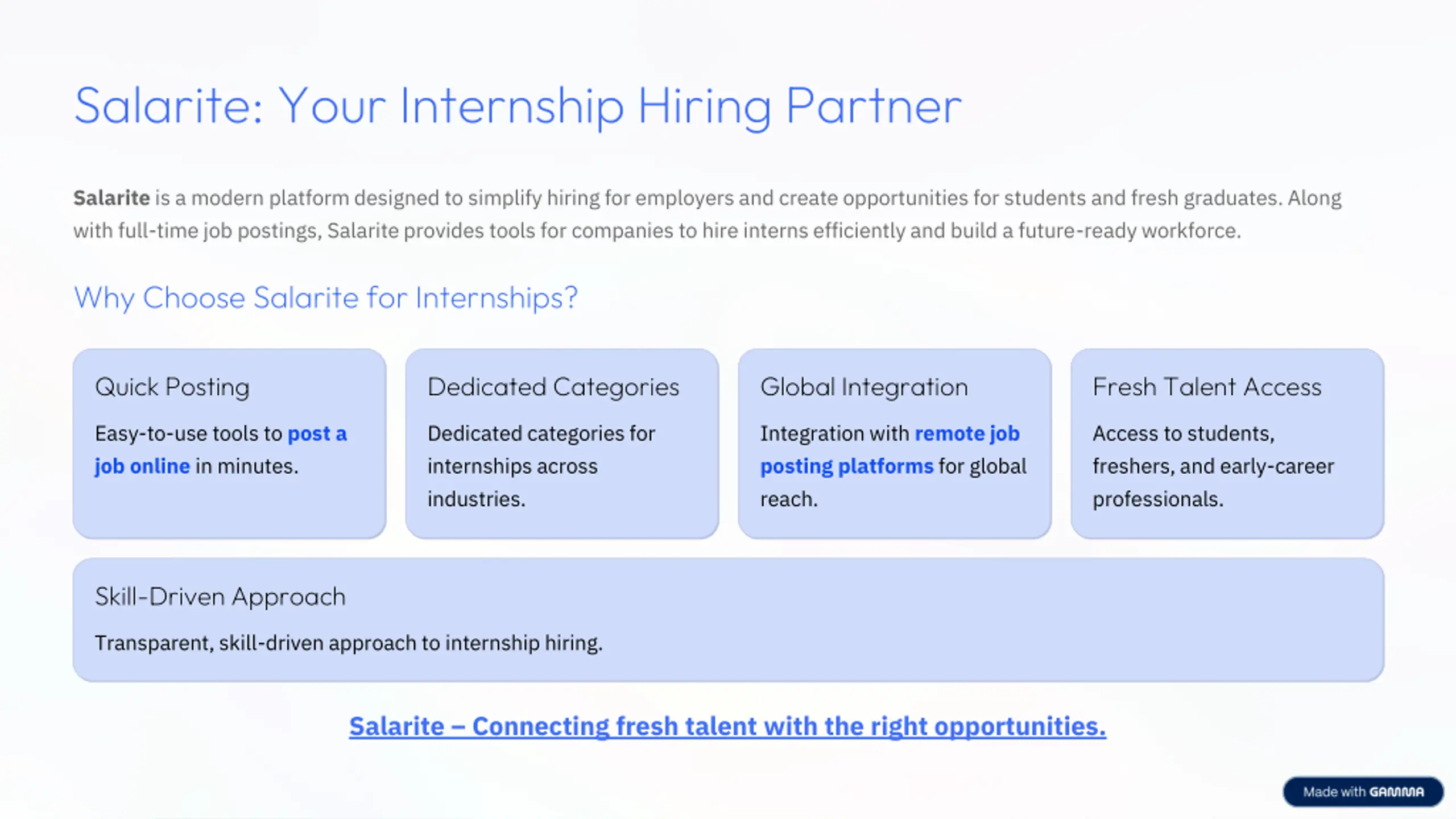 Salarite: Your Internship Hiring Partner Salarite is a modern platform designed to simplify hiring for employers and create opportunities for students and fresh graduates. Along with full-time job postings, Salarite provides tools for companies to hire interns efficiently and build a future-ready workforce. Why Choose Salarite for Internships? Quick Posting Dedicated Categories Global Integration Fresh Talent Access Easy-to-use tools to post a job online in minutes. Dedicated categories for internships across industries. Integration with remote job posting platforms for global reach. Access to students, freshers, and early-career professionals. Skill-Driven Approach Transparent, skill-driven approach to internship hiring. Salarite Connecting fresh talent with the right opportunities. preencoded.png