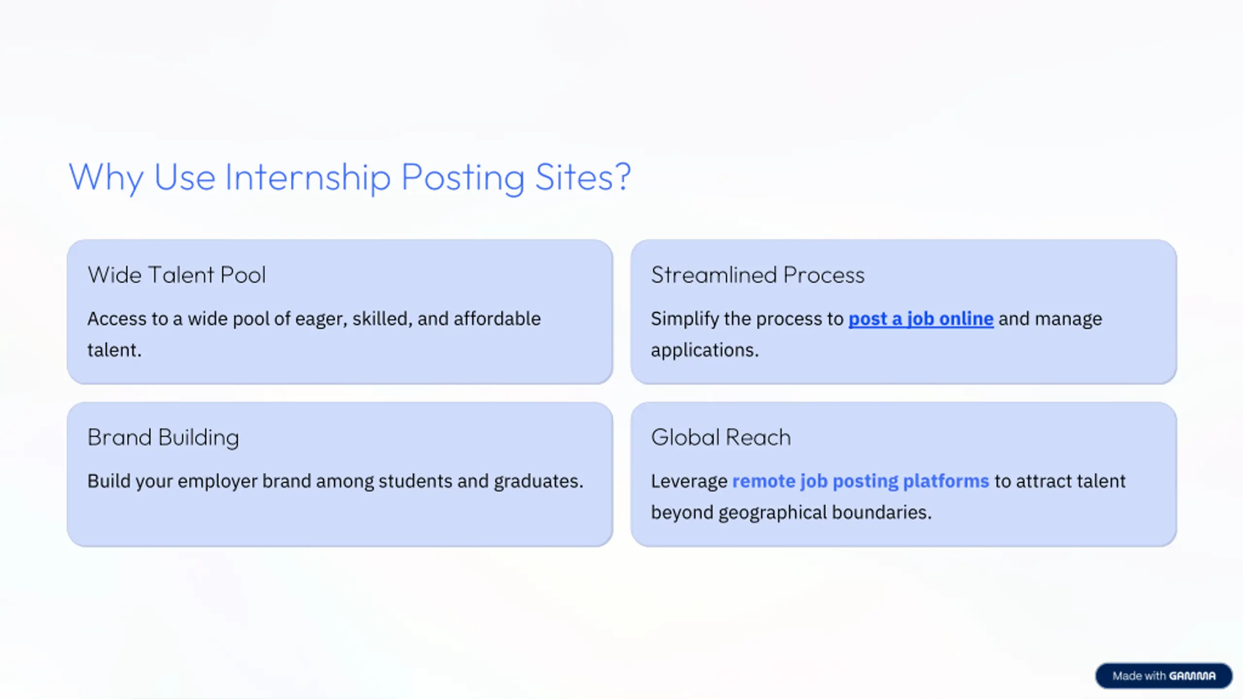 Why Use Internship Posting Sites? Wide Talent Pool Streamlined Process Access to a wide pool of eager, skilled, and affordable talent. Simplify the process to post a job online and manage applications. Brand Building Global Reach Build your employer brand among students and graduates. Leverage remote job posting platforms to attract talent beyond geographical boundaries. preencoded.png