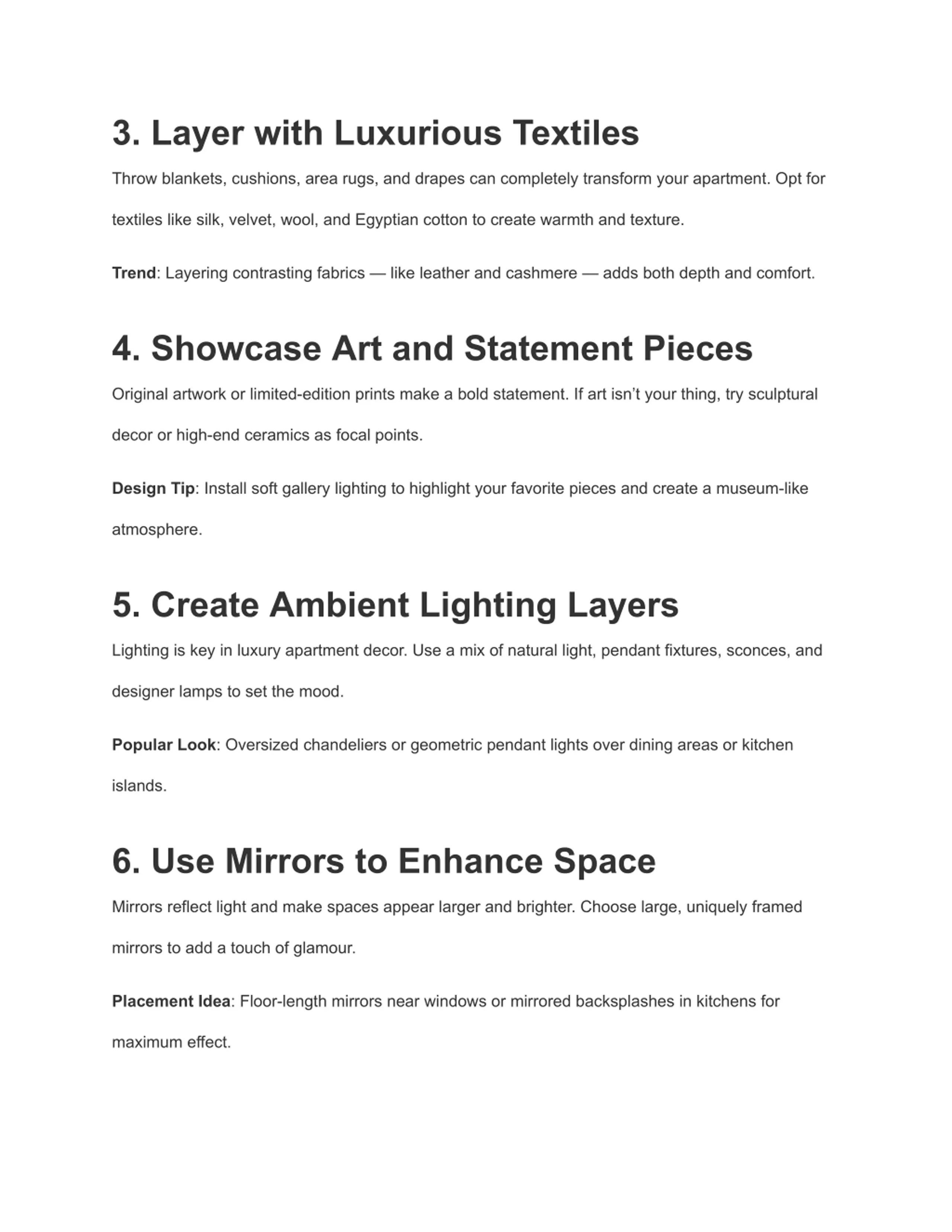 3. Layer with Luxurious Textiles Throw blankets, cushions, area rugs, and drapes can completely transform your apartment. Opt for textiles like silk, velvet, wool, and Egyptian cotton to create warmth and texture. Trend: Layering contrasting fabrics like leather and cashmere adds both depth and comfort. 4. Showcase Art and Statement Pieces Original artwork or limited-edition prints make a bold statement. If art isn t your thing, try sculptural decor or high-end ceramics as focal points. Design Tip: Install soft gallery lighting to highlight your favorite pieces and create a museum-like atmosphere. 5. Create Ambient Lighting Layers Lighting is key in luxury apartment decor. Use a mix of natural light, pendant fixtures, sconces, and designer lamps to set the mood. Popular Look: Oversized chandeliers or geometric pendant lights over dining areas or kitchen islands. 6. Use Mirrors to Enhance Space Mirrors reflect light and make spaces appear larger and brighter. Choose large, uniquely framed mirrors to add a touch of glamour. Placement Idea: Floor-length mirrors near windows or mirrored backsplashes in kitchens for maximum effect.