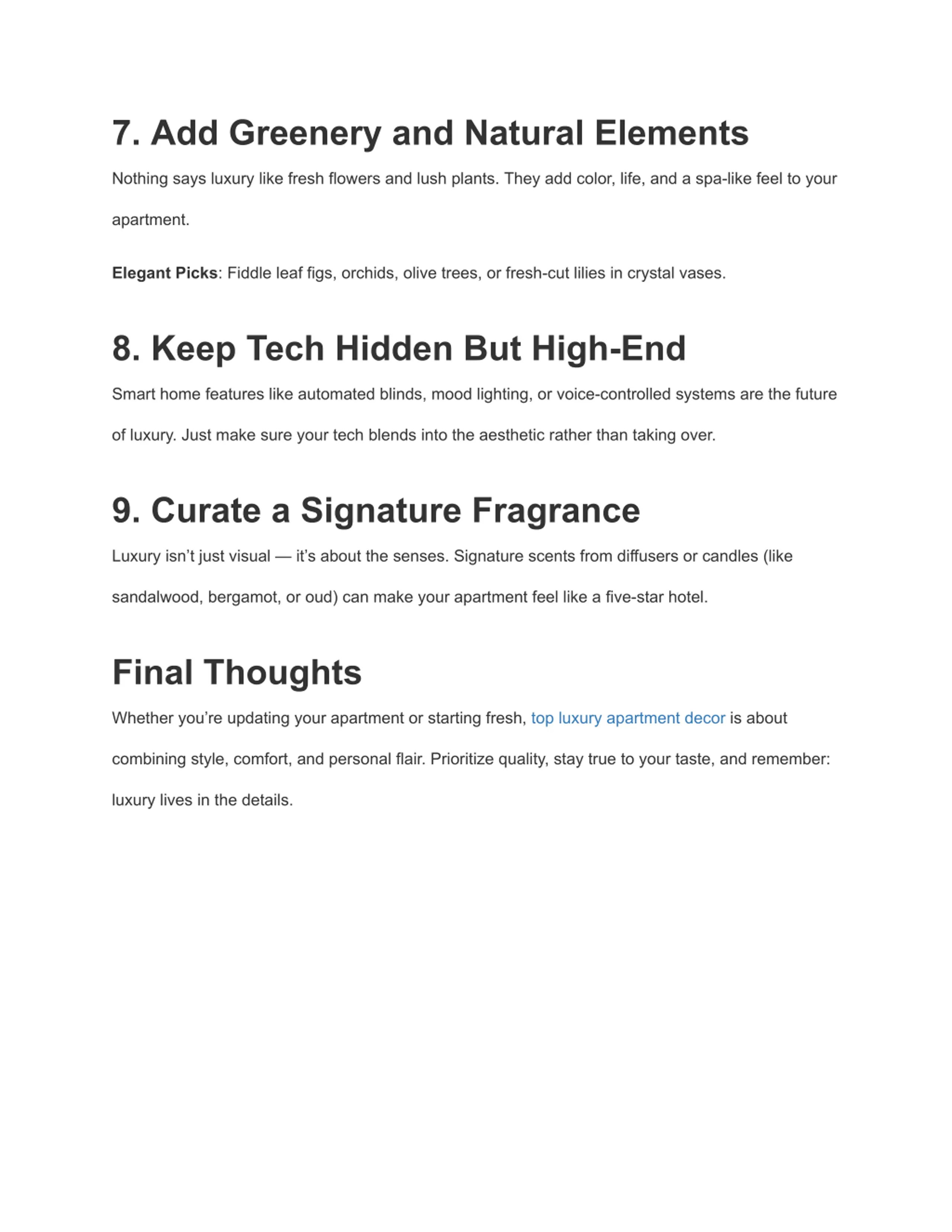 7. Add Greenery and Natural Elements Nothing says luxury like fresh flowers and lush plants. They add color, life, and a spa-like feel to your apartment. Elegant Picks: Fiddle leaf figs, orchids, olive trees, or fresh-cut lilies in crystal vases. 8. Keep Tech Hidden But High-End Smart home features like automated blinds, mood lighting, or voice-controlled systems are the future of luxury. Just make sure your tech blends into the aesthetic rather than taking over. 9. Curate a Signature Fragrance Luxury isn t just visual it s about the senses. Signature scents from diffusers or candles (like sandalwood, bergamot, or oud) can make your apartment feel like a five-star hotel. Final Thoughts Whether you re updating your apartment or starting fresh, top luxury apartment decor is about combining style, comfort, and personal flair. Prioritize quality, stay true to your taste, and remember: luxury lives in the details.