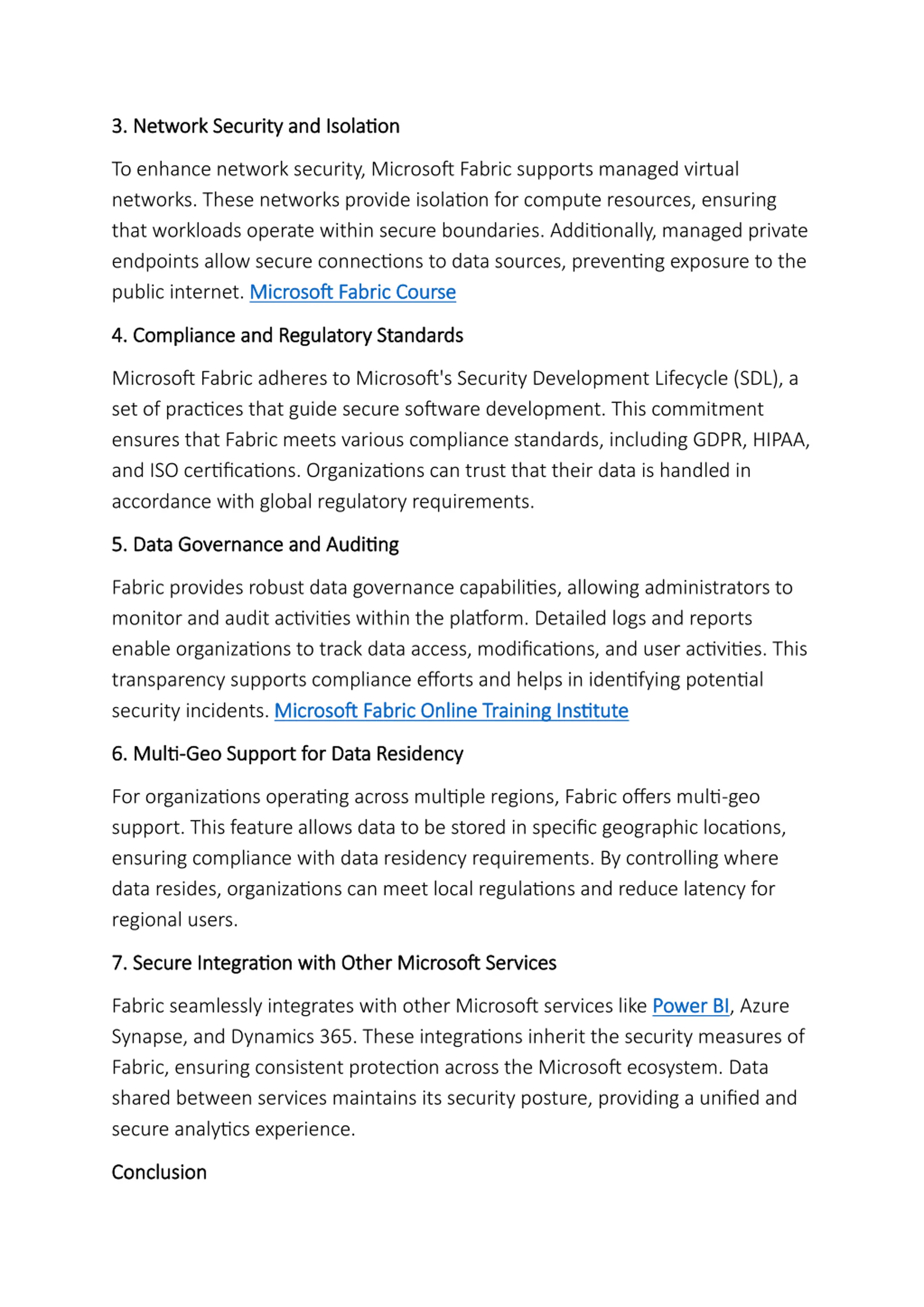 3. Network Security and Isolation 3. Network Security and Isolation To enhance network security, Microsoft Fabric supports managed virtual networks. These networks provide isolation for compute resources, ensuring that workloads operate within secure boundaries. Additionally, managed private endpoints allow secure connections to data sources, preventing exposure to the public internet. Microsoft Fabric Course Microsoft Fabric Course 4. Compliance and Regulatory Standards 4. Compliance and Regulatory Standards Microsoft Fabric adheres to Microsoft's Security Development Lifecycle (SDL), a set of practices that guide secure software development. This commitment ensures that Fabric meets various compliance standards, including GDPR, HIPAA, and ISO certifications. Organizations can trust that their data is handled in accordance with global regulatory requirements. 5. Data Governance and Auditing 5. Data Governance and Auditing Fabric provides robust data governance capabilities, allowing administrators to monitor and audit activities within the platform. Detailed logs and reports enable organizations to track data access, modifications, and user activities. This transparency supports compliance efforts and helps in identifying potential security incidents. Microsoft Fabric Online Training Institute Microsoft Fabric Online Training Institute 6. Multi 6. Multi- -Geo Support for Data Residency Geo Support for Data Residency For organizations operating across multiple regions, Fabric offers multi-geo support. This feature allows data to be stored in specific geographic locations, ensuring compliance with data residency requirements. By controlling where data resides, organizations can meet local regulations and reduce latency for regional users. 7. Secure Integration with Other Microsoft Services 7. Secure Integration with Other Microsoft Services Fabric seamlessly integrates with other Microsoft services like Power BI Synapse, and Dynamics 365. These integrations inherit the security measures of Fabric, ensuring consistent protection across the Microsoft ecosystem. Data shared between services maintains its security posture, providing a unified and secure analytics experience. Power BI, Azure Conclusion Conclusion